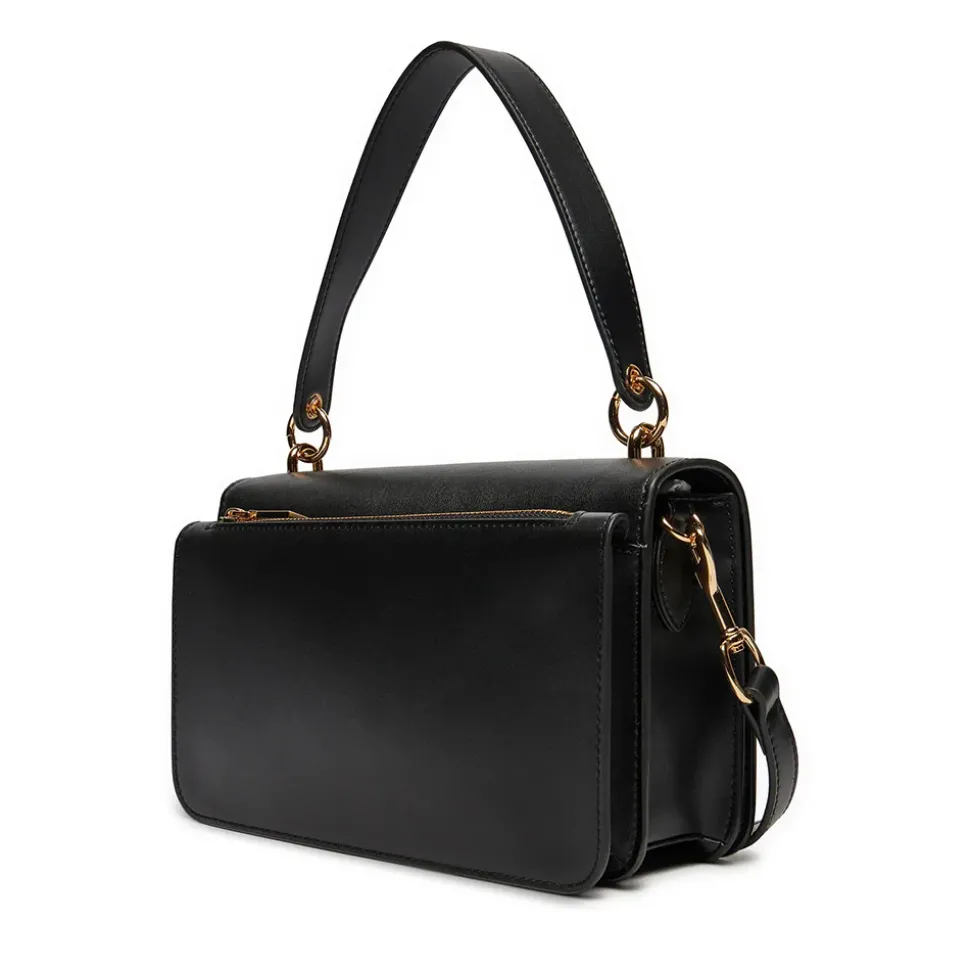Borsa chiusa con pattina e clip magnetica. Tasca posteriore con zip. Cuore con logo LM impresso. Logo lettering frontale. Tracolla regolabile e removibile.