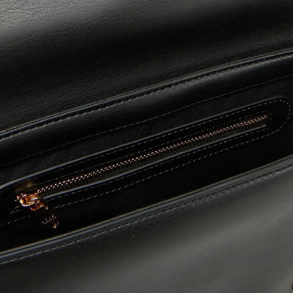 Borsa a tracolla in pelle nera chiusa pattina e clip magnetica. Catena decorativa frontale. Tracolla regolabile e removibile.