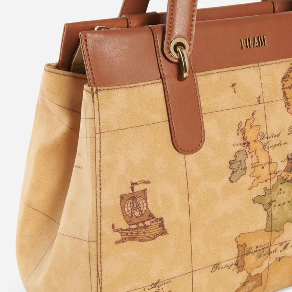 Borsa a mano realizzata dal design retrò in tessuto stampato con cartina geografica Geo Classic dalla doppia portabilità, a mano e a tracolla. Ha i manici in pelle, tracolla removibile, chiusura con zip. La forma geometrica e i dettagli la rendono la city bag per eccellenza.