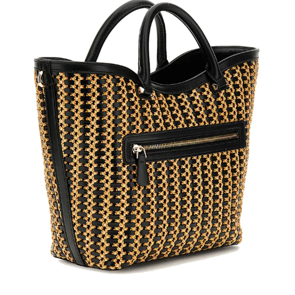 Borsa a mano in rafia. Unico scomparto foderato, chiuso con clip automatica. Tasca interna e sul retro con cerniera lampo. Dettagli metallici frontali e laterali. Tasca esterna chiusa con zip. Tracolla regolabile e rimovibile della lunghezza di circa 110/130 cm.