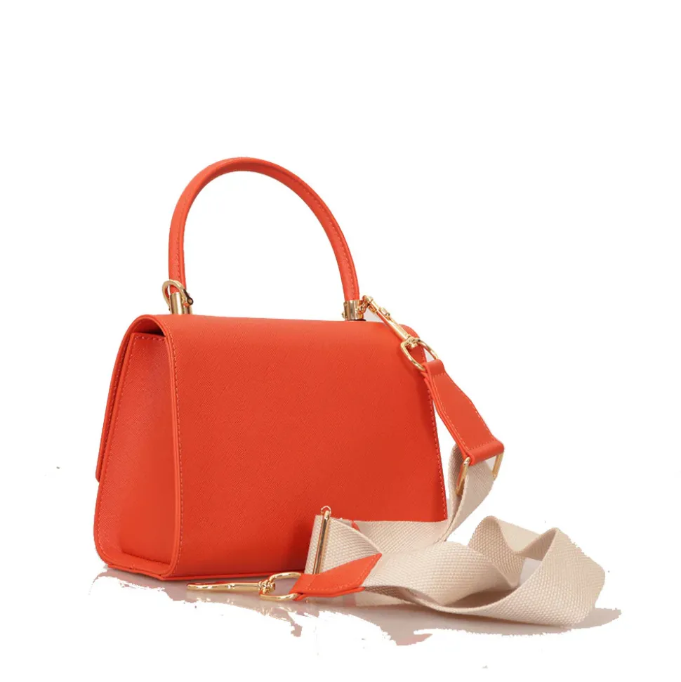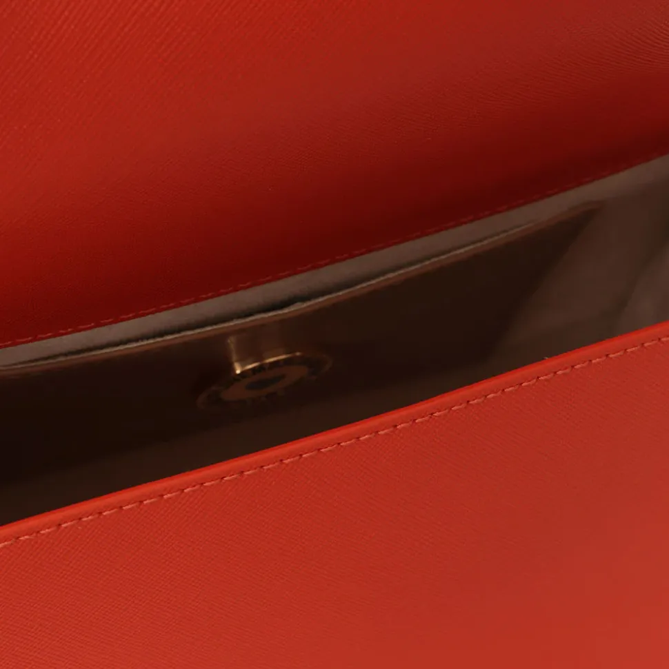 Borsa in ecopelle chiusa con pattina. Heart Logo in metallo con incisione logo Lettering. Manico rigido. Tracolla in nastro regolabile.