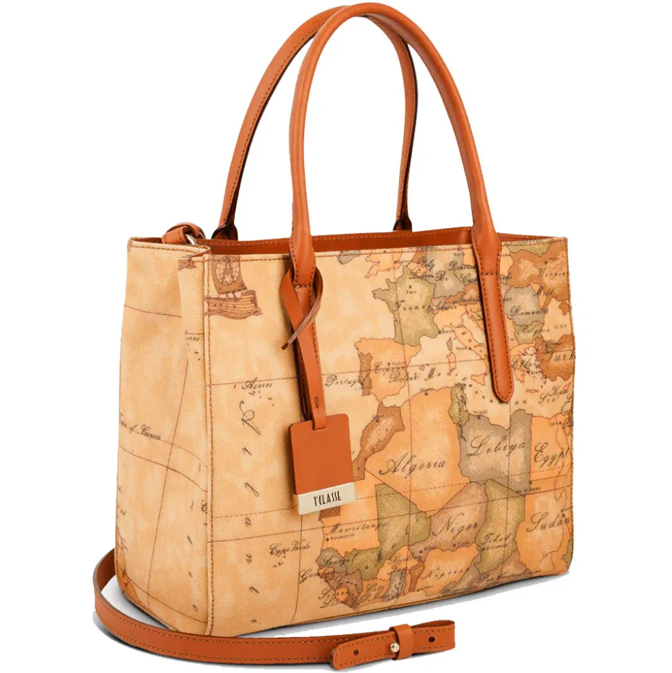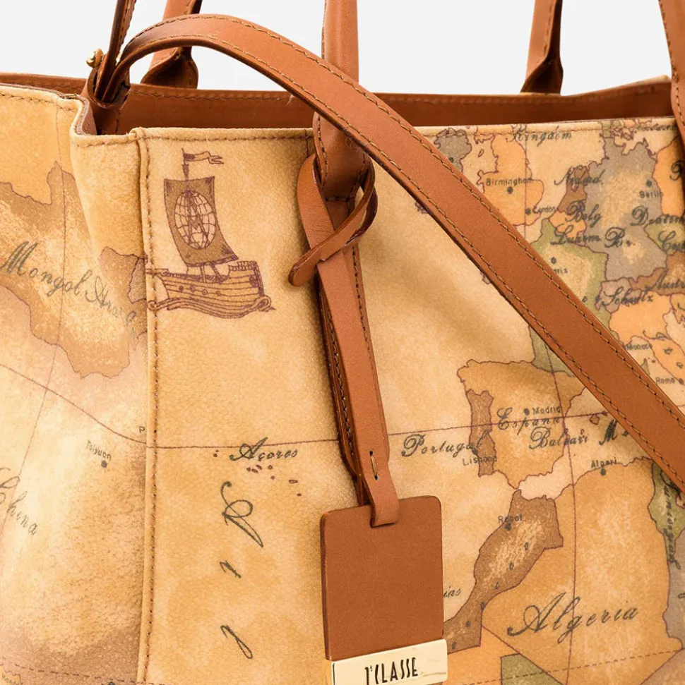 Borsa a mano in tessuto stampato con cartina geografica Geo Classic dalla doppia portabilità, a mano e a tracolla. Ha i dettagli in pelle liscia di bovino color cuoio, doppi manici, tracolla removibile, tre tasche interne. L’accessorio ideale per rifinire i tuoi look.