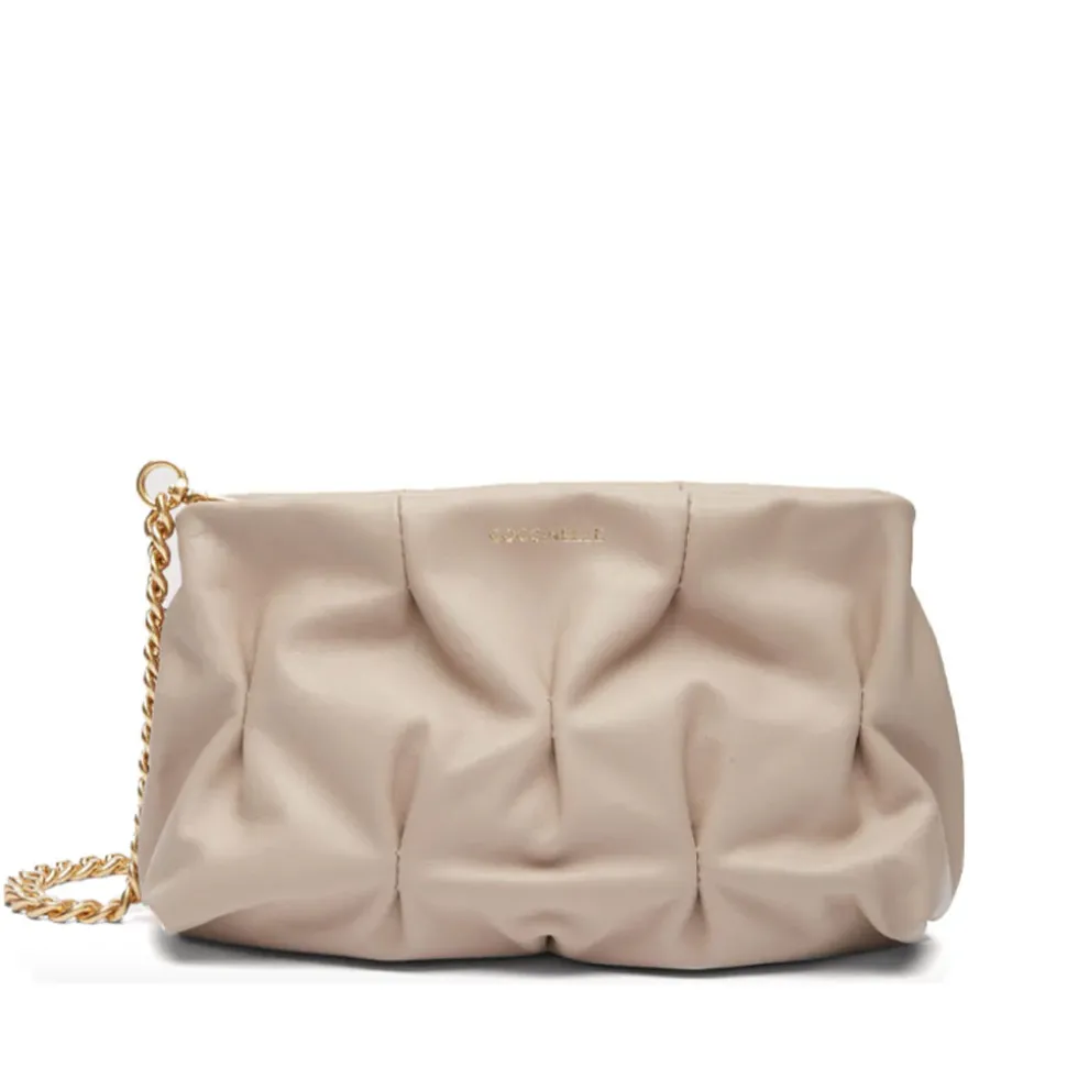 Borsa donna a mano mini con tracolla in pelle liscia Coccinelle linea Ophelie colore powder pink chiusa con calamita. Manico in catena rimovibile e tracolla in catena regolabile e rimovibile in pelle. Interno foderato e organizzato.
