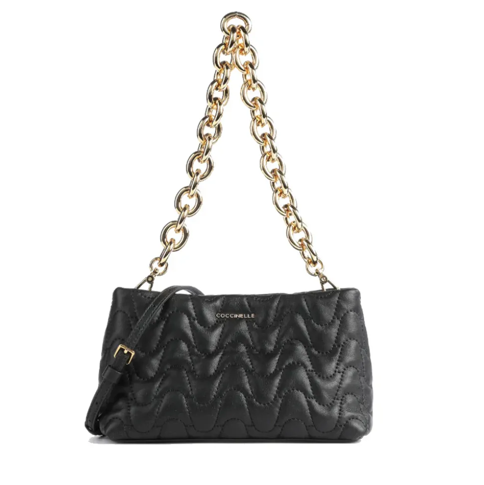 Borsa donna a mano mini con tracolla in pelle matelassè Coccinelle linea Ophelie colore nero chiusa con calamita. Manico in catena rimovibile e tracolla in catena regolabile e rimovibile in pelle. Interno foderato e organizzato.