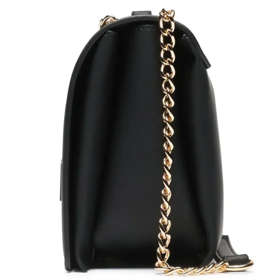 Borsa in ecopelle liscia chiusa con pattina e clip magnetica. Logo Lettering in metallo applicato sul davanti. Tracolla scorrevole in catena con salvaspalla in ecopelle.