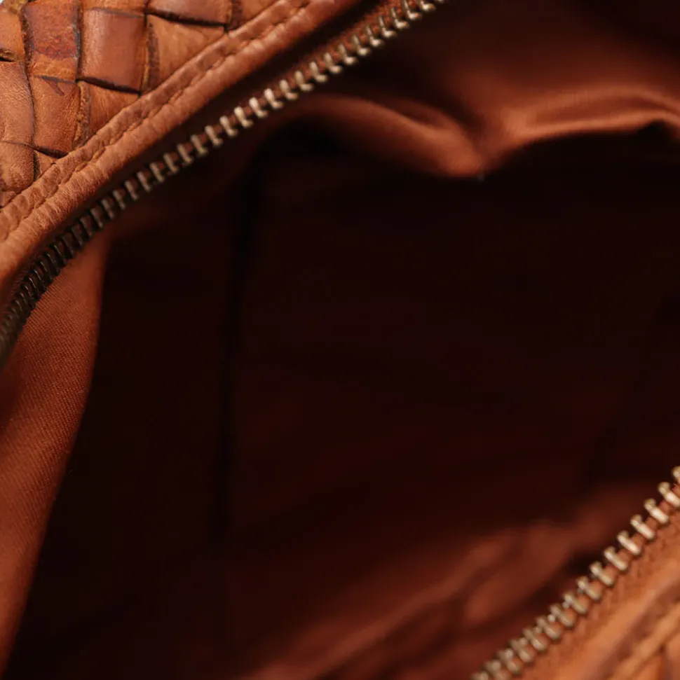 Borsa doppia portabilità in pelle intrecciata chiusa con zip. Tasca posteriore con zip. Portabilità a spalla e a tracolla. Manico e tracolla sono removibili.