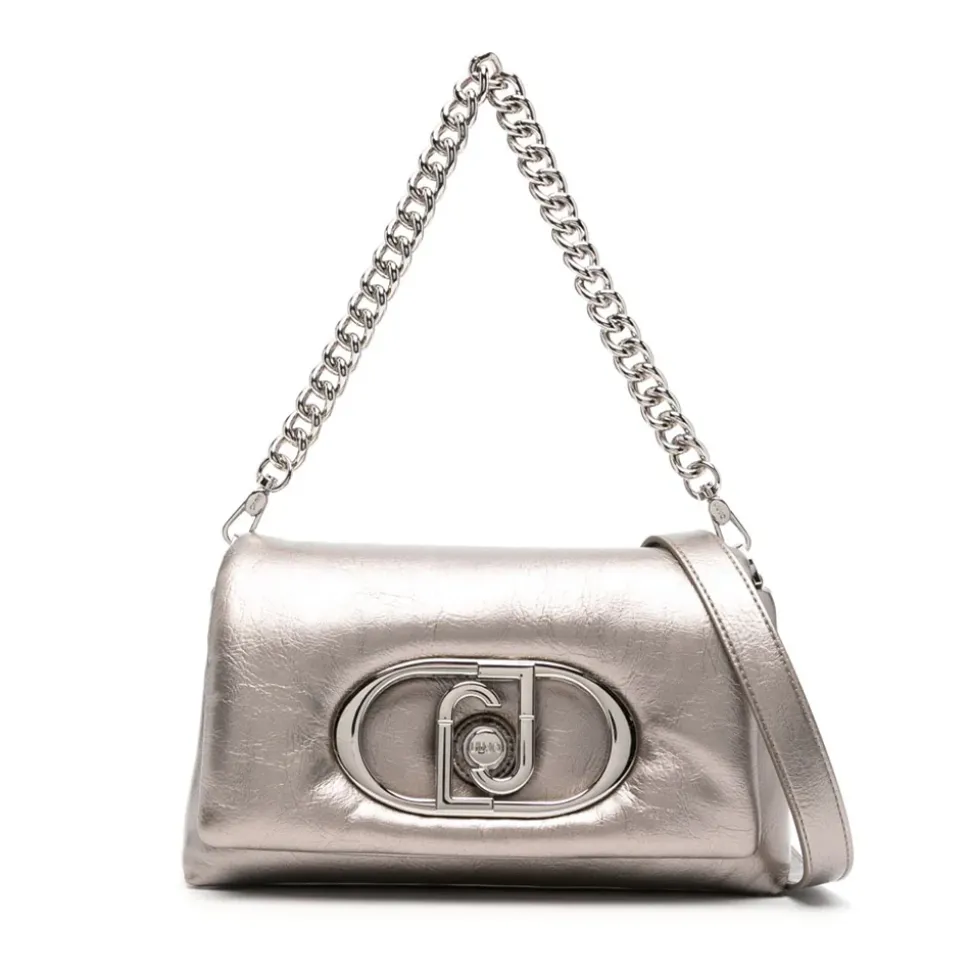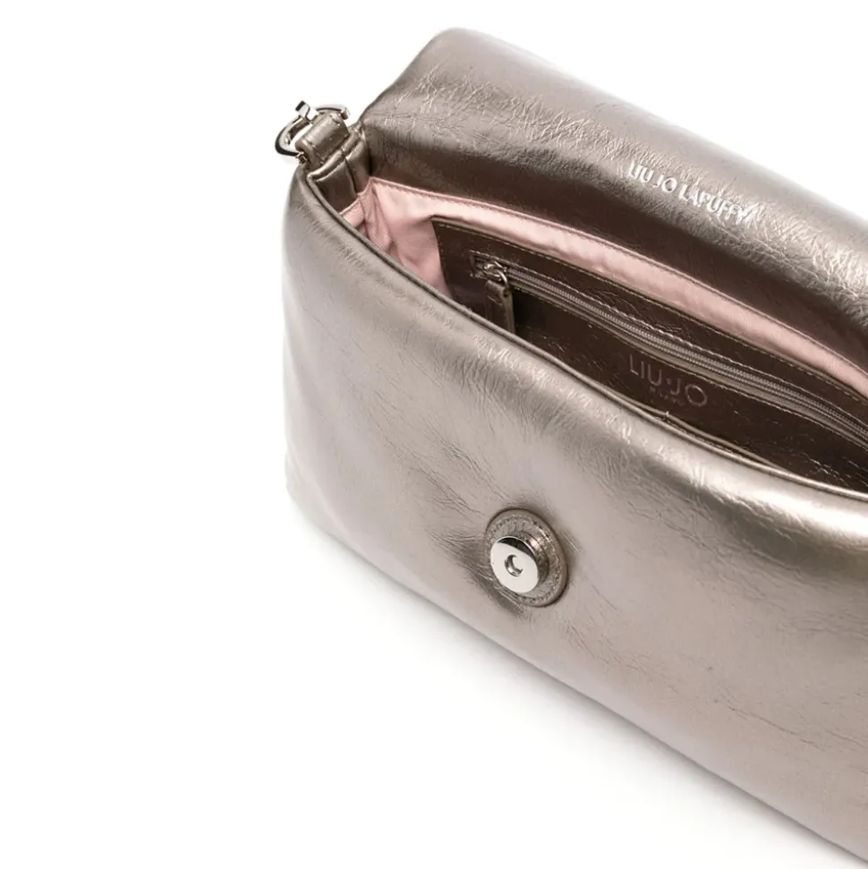 Borsa a spalla in ecopelle metallizzata e imbottita chiusa con pattina. Comodo manico rimovibile a catena. Tracolla rimovibile. Logo in metallo sul davanti.