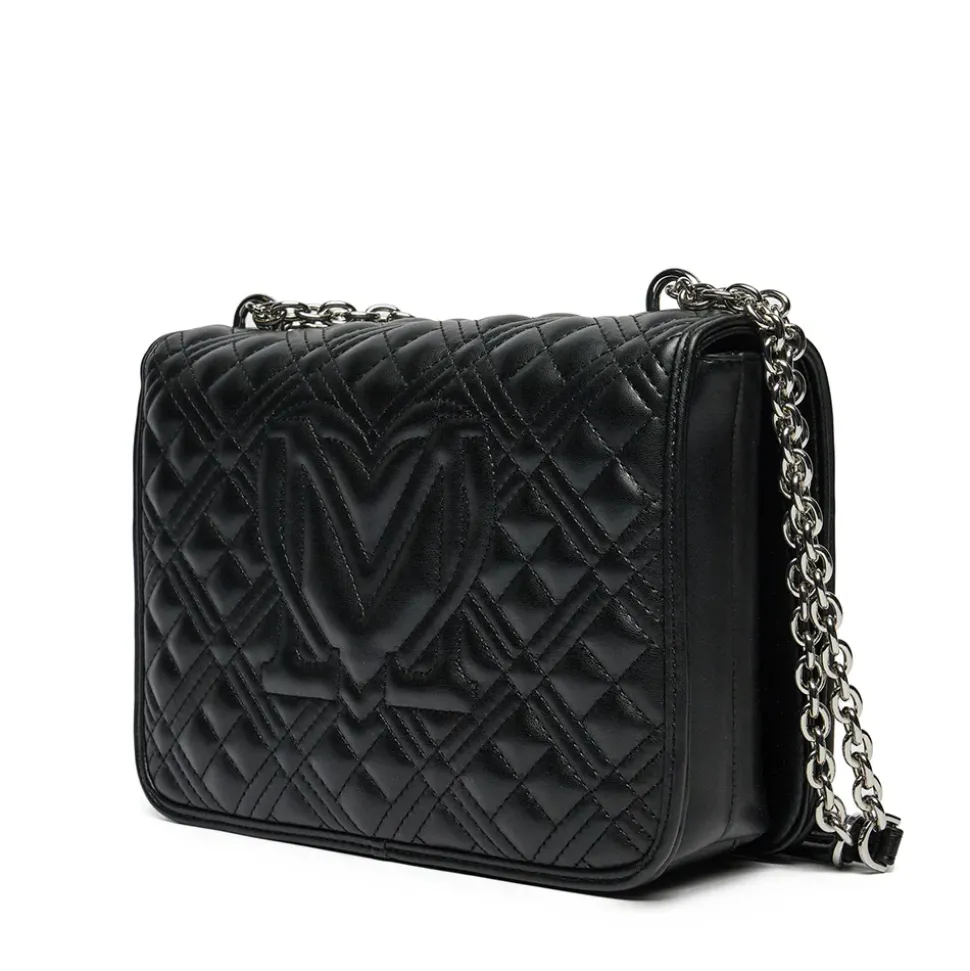 Borsa a spalla in ecopelle effetto trapuntato chiusa con pattina. Heart LM Logo trapuntato sul dietro. Logo Lettering in metallo sul davanti. Tracolla a catena scorrevole con spallacci.