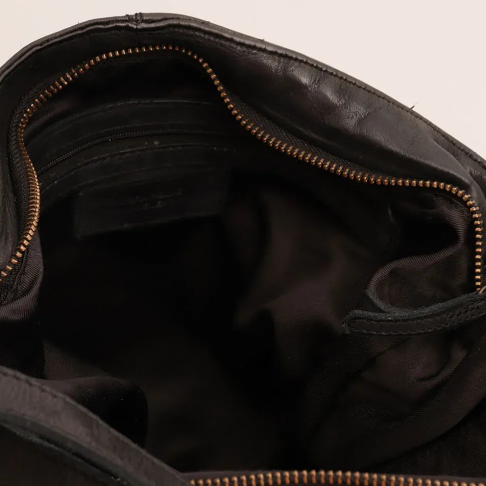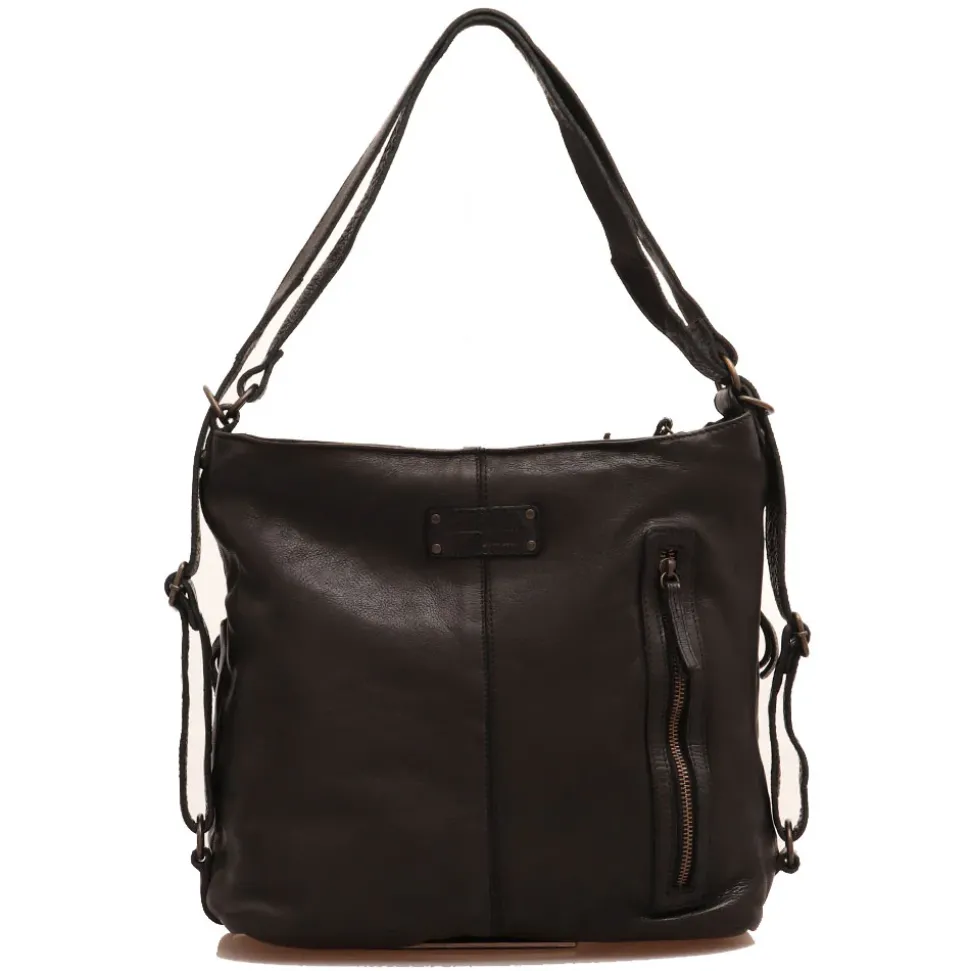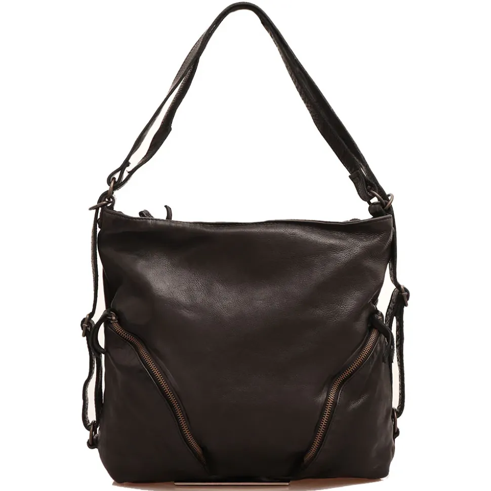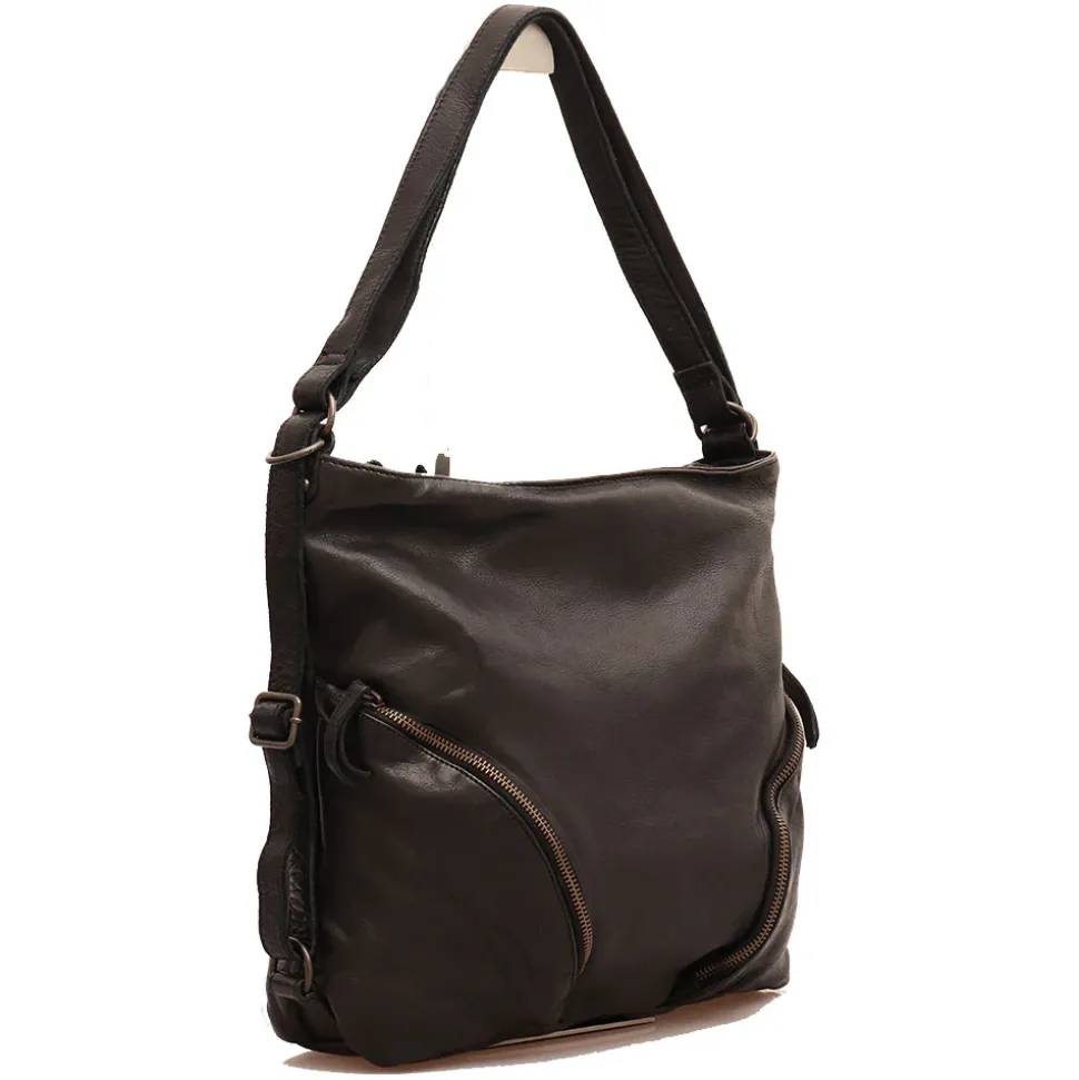 Borsa sacca a spalla in pelle marrone chiusa con zip. Due comode tasche frontali chiuse con zip. Tasca posteriore con chiusura verticale con zip. Manico regolabile.