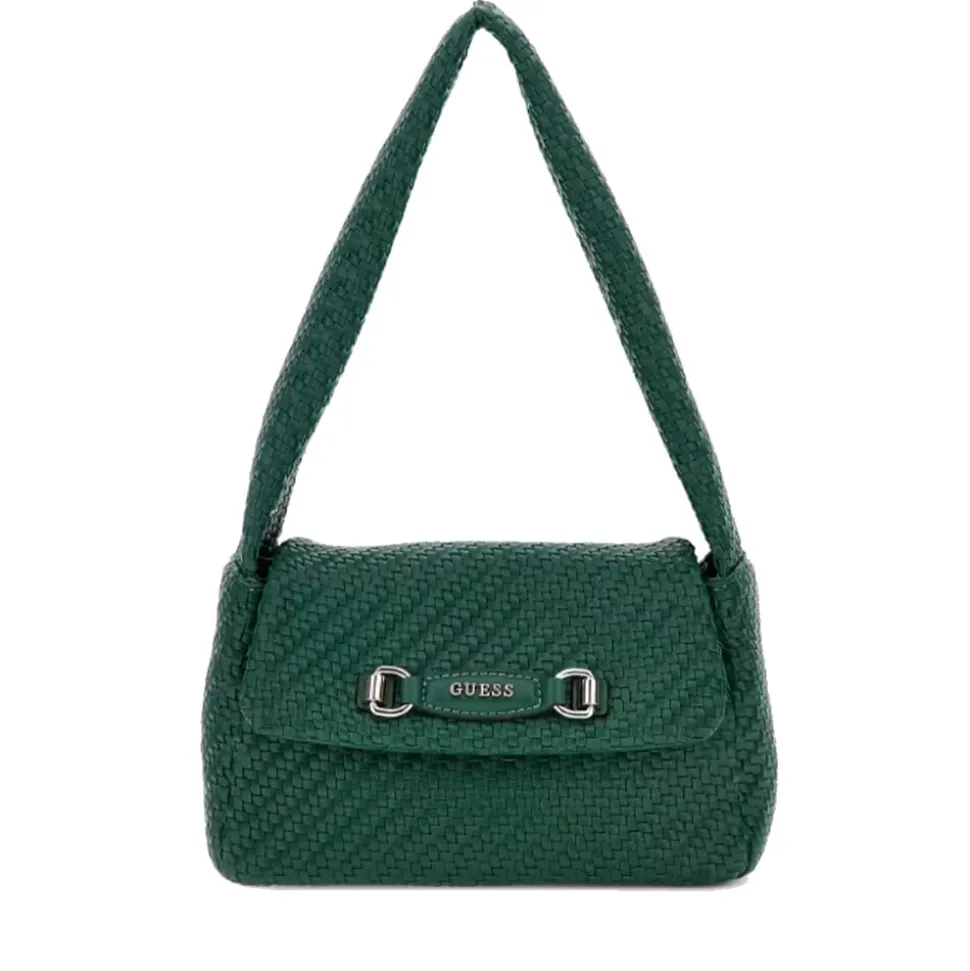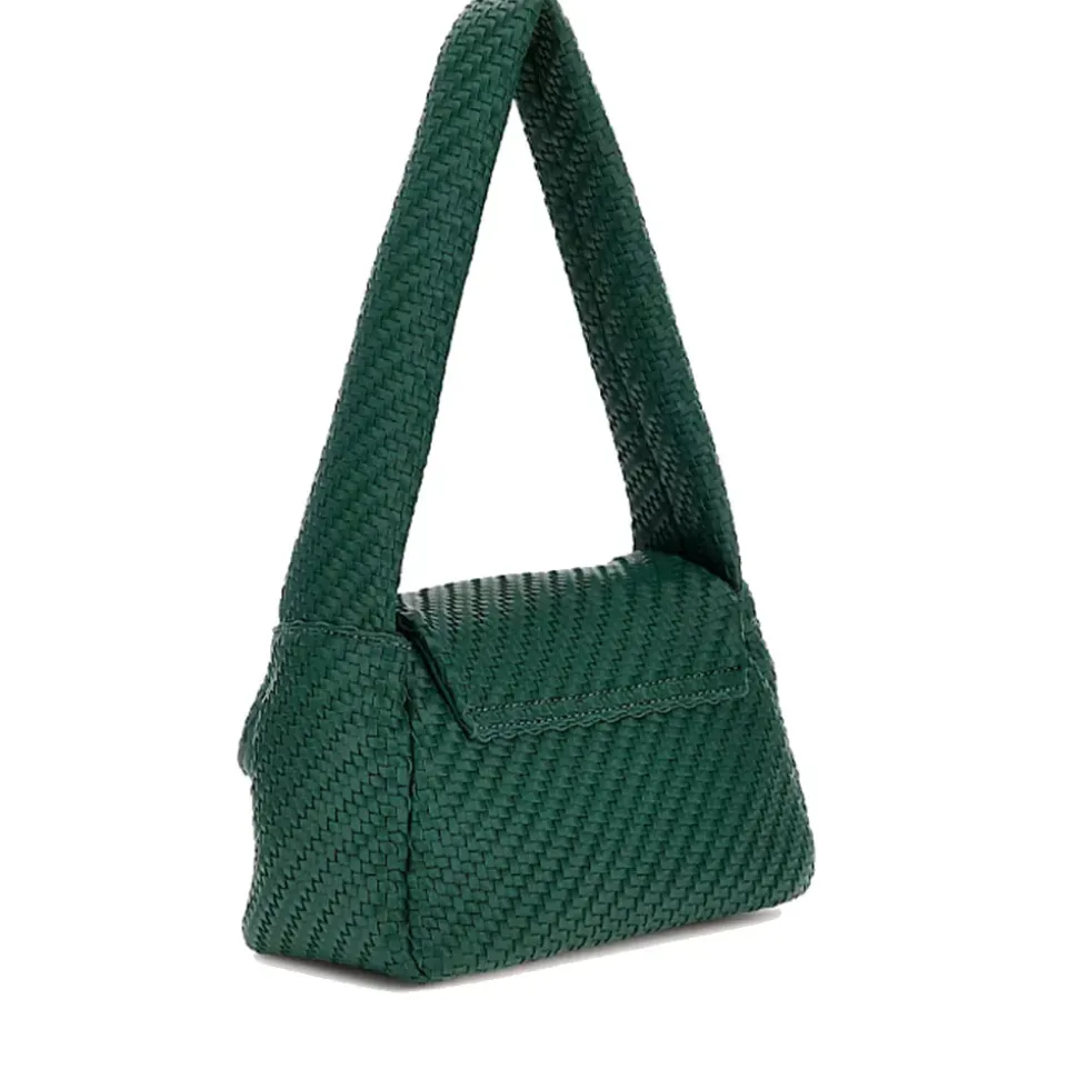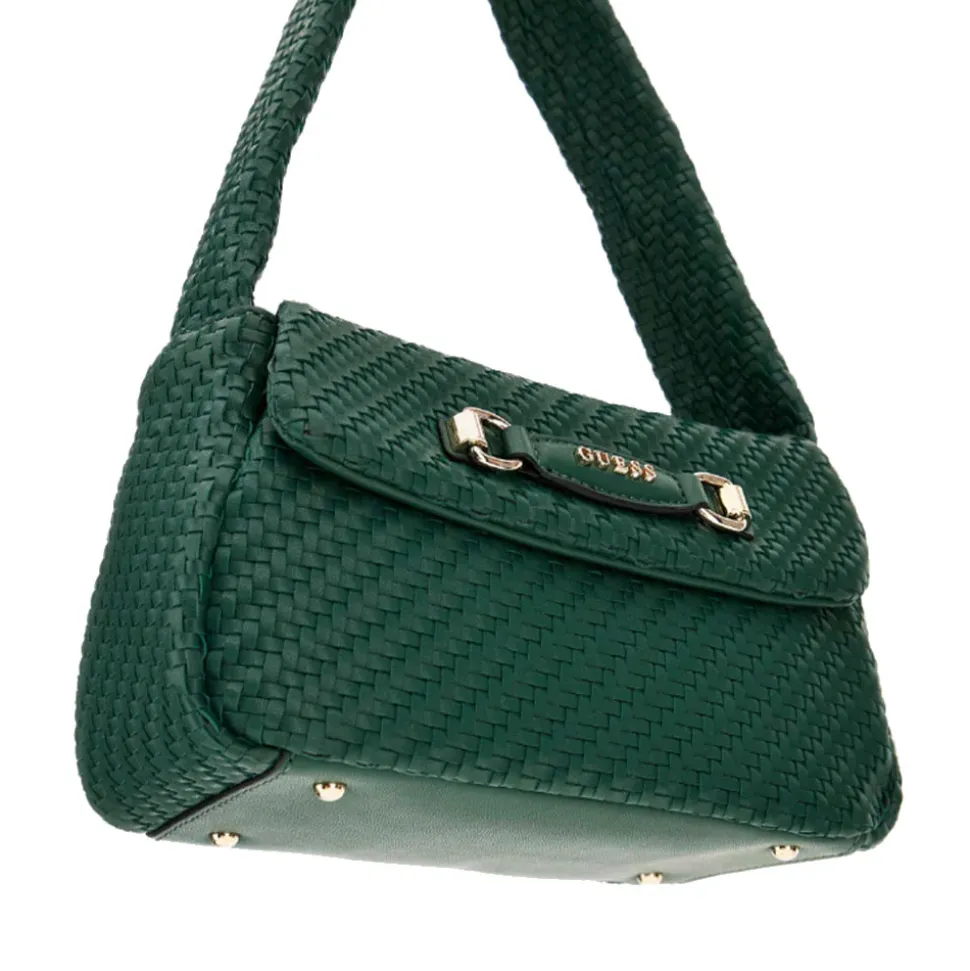 Borsa a spalla in ecopelle intrecciata. Unico scomparto foderato, chiuso con pattina e clip automatica. Dettagli metallici frontali e laterali. Logo frontale. Tasca interna chiusa con zip.