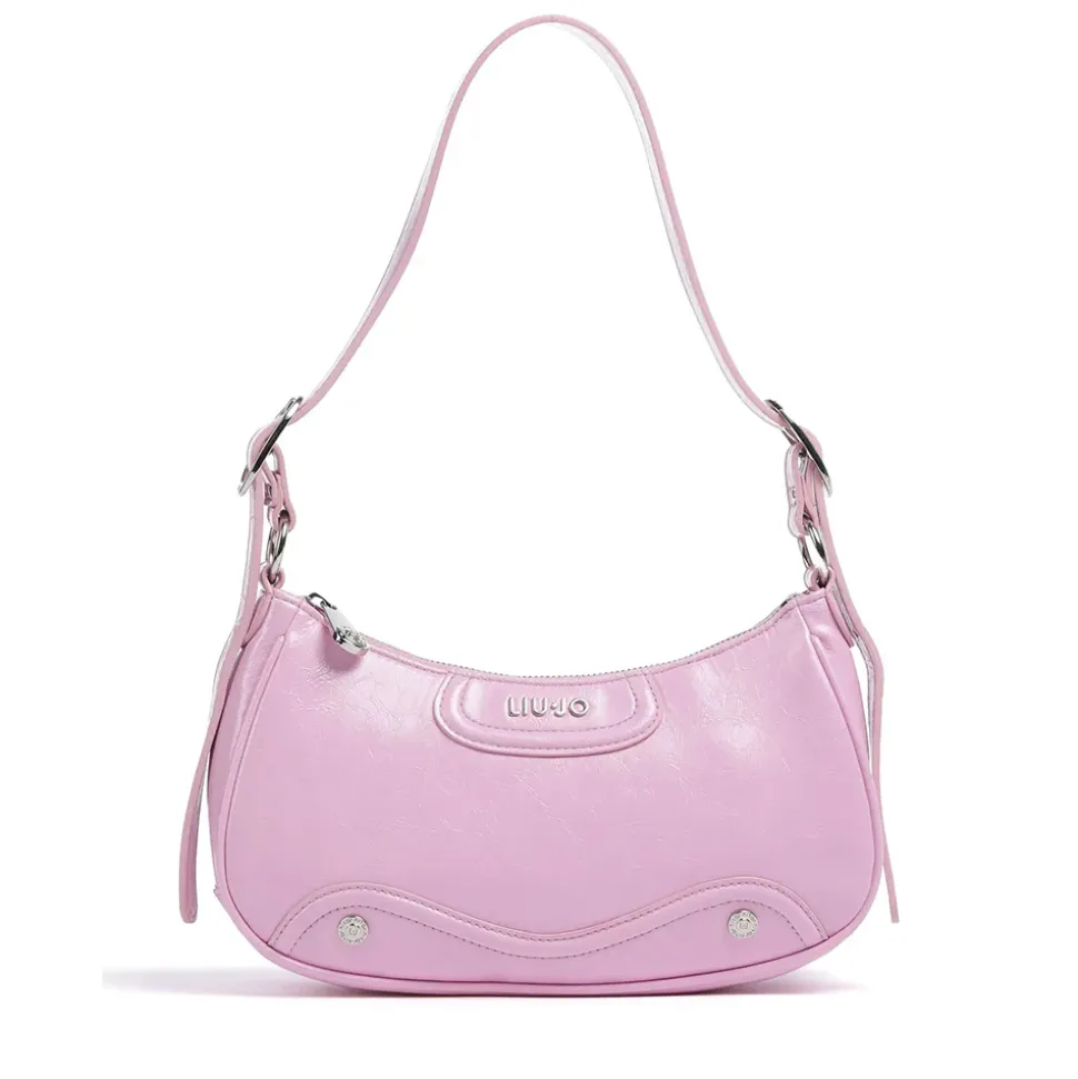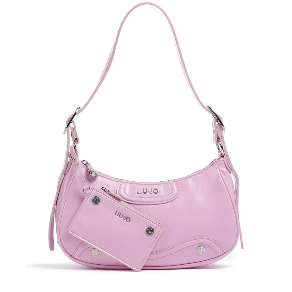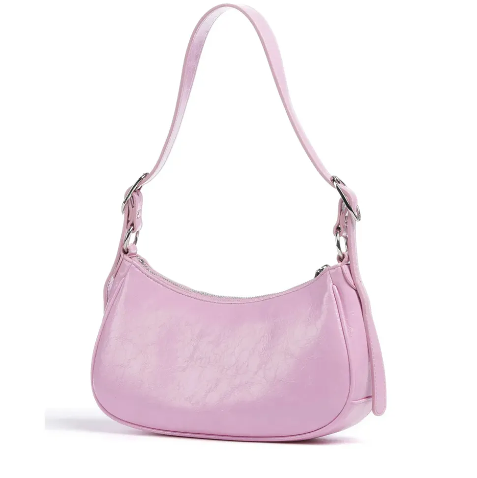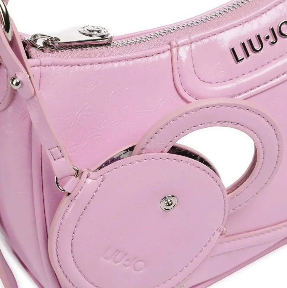Borsa a spalla, realizzata in ecopelle lucida, chiusa con zip. Fodera interna con stampa animalier. Uno charm con specchietto e uno portamonete. Logo in metallo sul davanti. Manico regolabile.