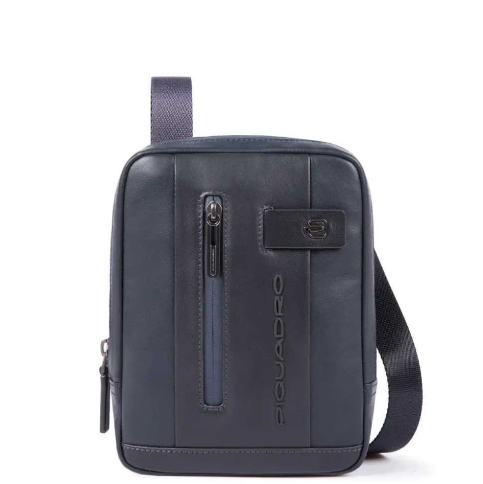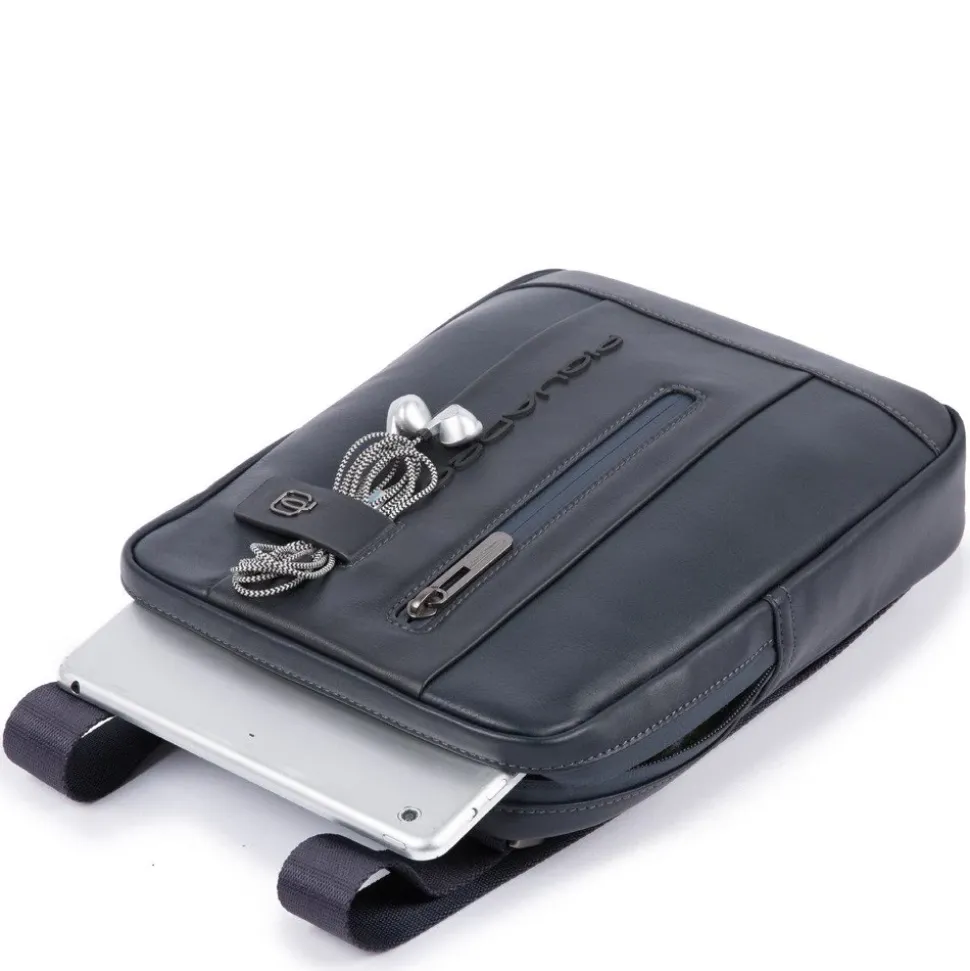 Borsello a tracolla in pelle blu Piquadro linea Urban. Con Porta iPad®mini, organizzazione interna fissa e tasca porta cellulare esterna.
