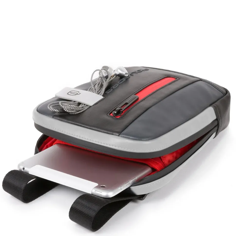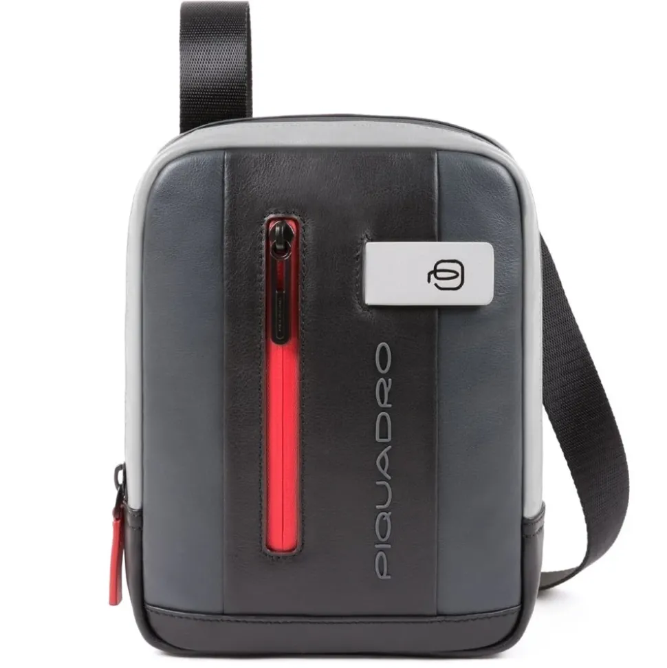 Borsello a tracolla in pelle grigia e nera Piquadro linea Urban. Con Porta iPad®mini, organizzazione interna fissa e tasca porta cellulare esterna.
