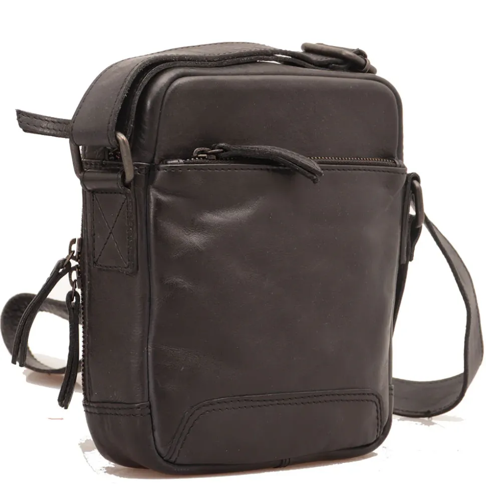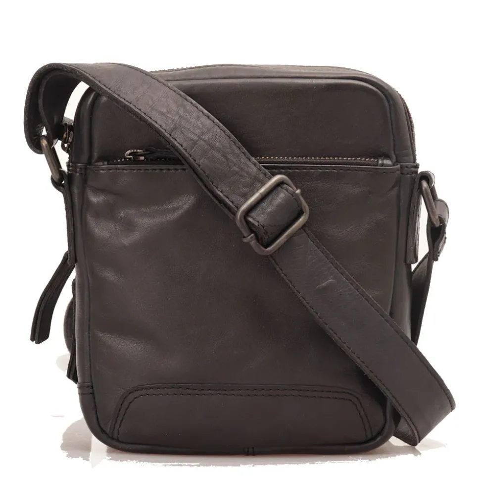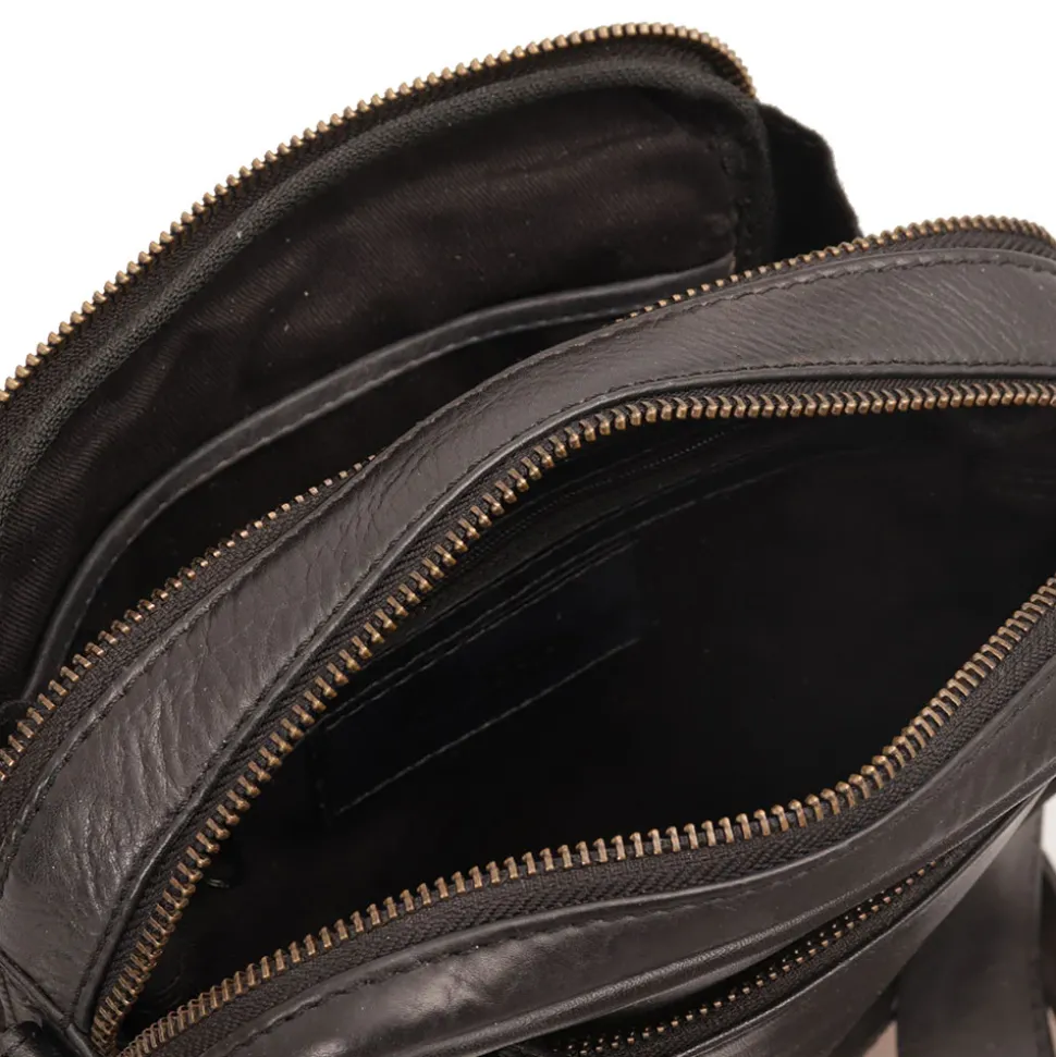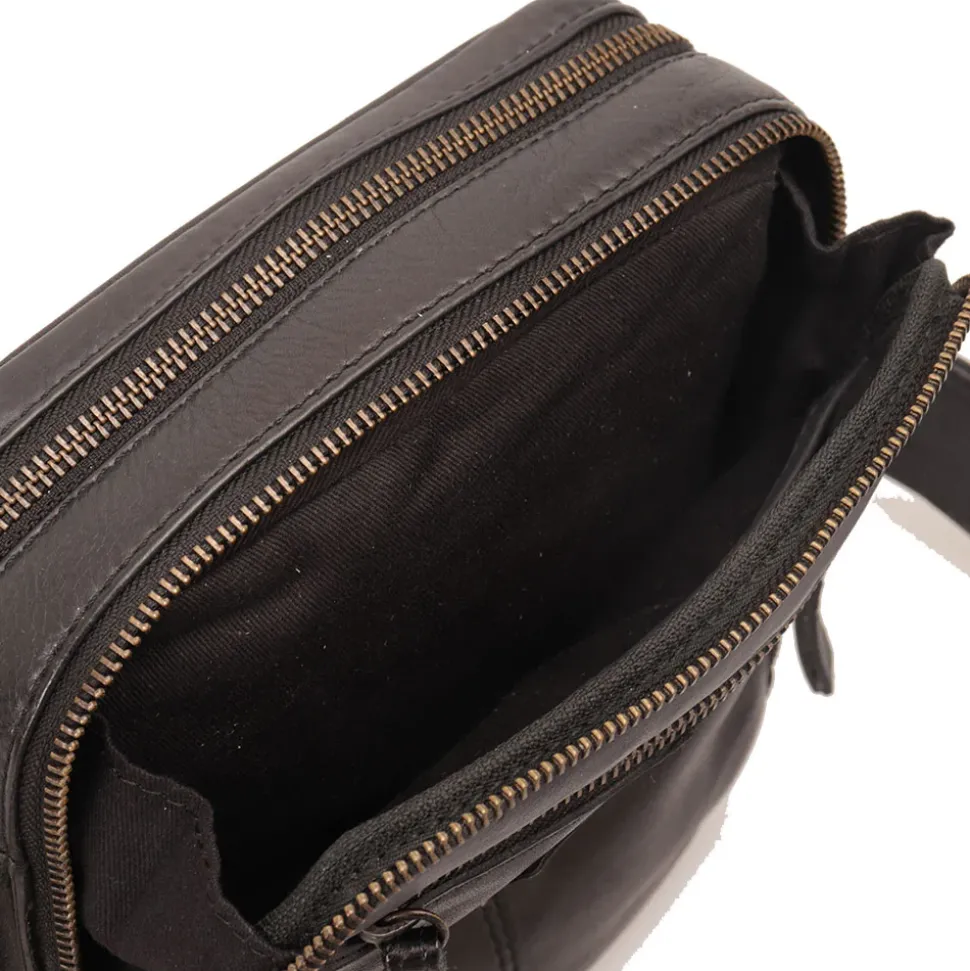 Borsello diviso in due scomparti principali chiusi con zip. Tasca frontale e posteriore chiuse con zip. Tracolla in pelle regolabile.