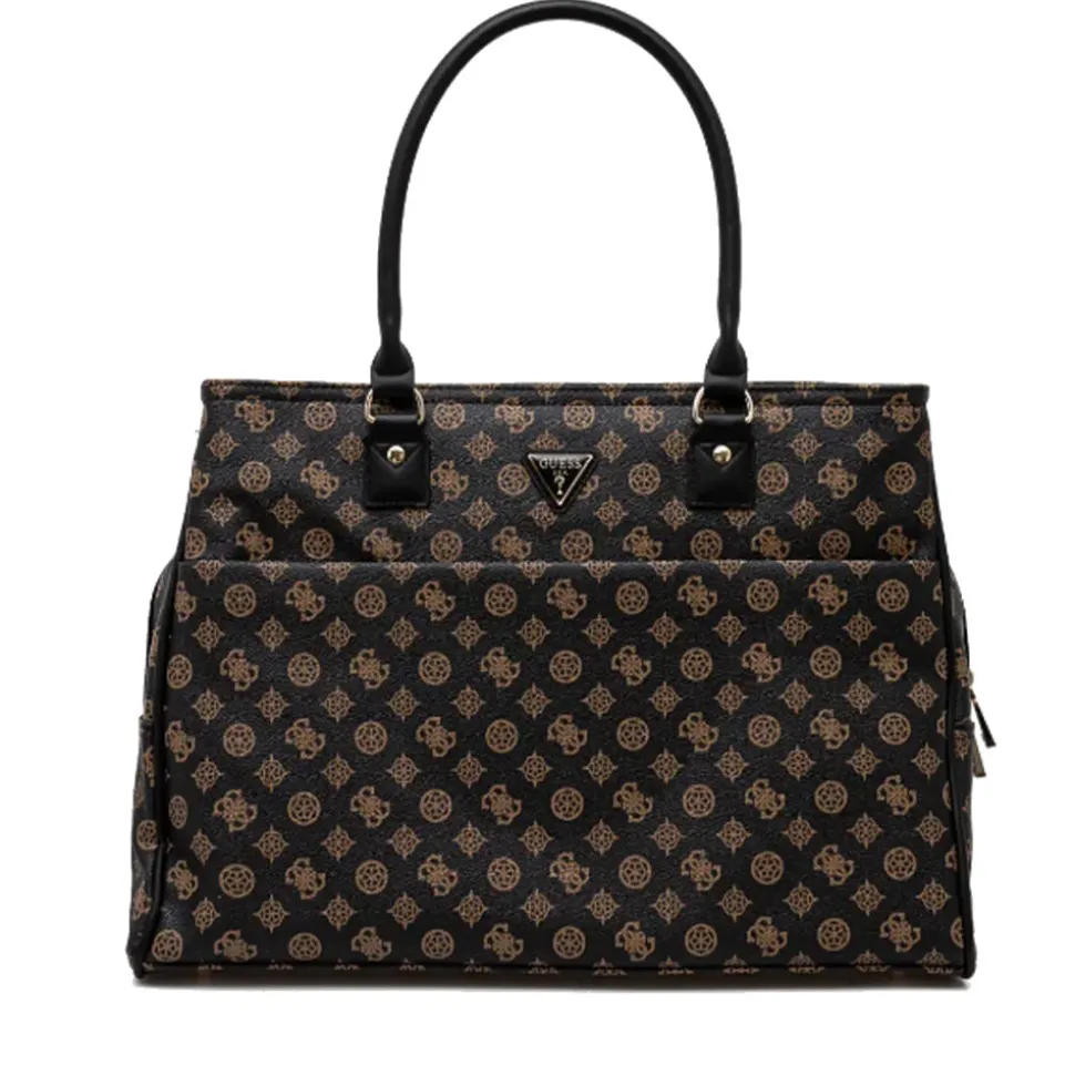 Borsone da viaggio due manici in ecopelle logata. Unico scomparto foderato e organizzato chiuso con zip. Tasche interne organizzate. Logo Guess in metallo sul davanti. Due manici in ecopelle della lunghezza circa di 35 cm. Tasca frontale chiusa co zip. Aggancio al trolley con cordella.