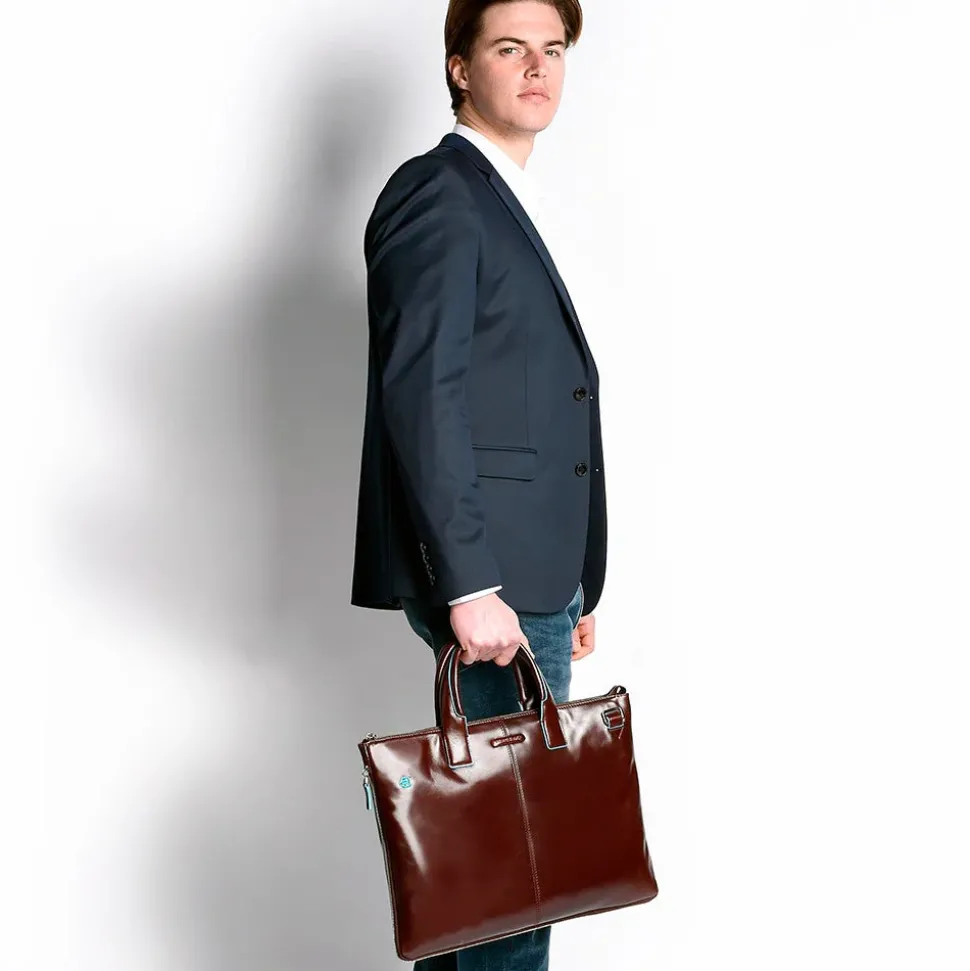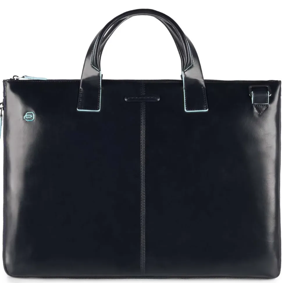 Cartella sottile espandibile Piquadro porta pc 15,6″ in pelle blu. Organizzazione interna fissa per documenti, computer e tablet. Tracolla rimovibile e regolabile. Aggancio al trolley con cordella.