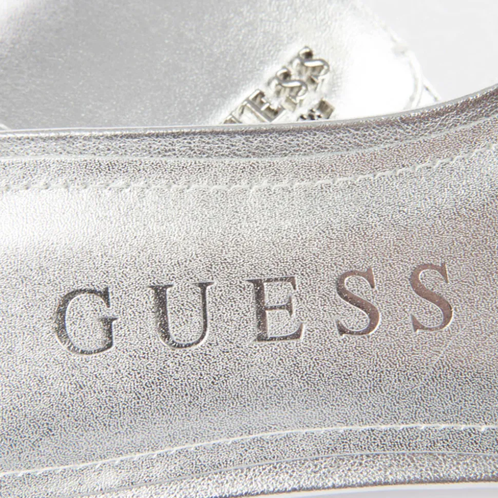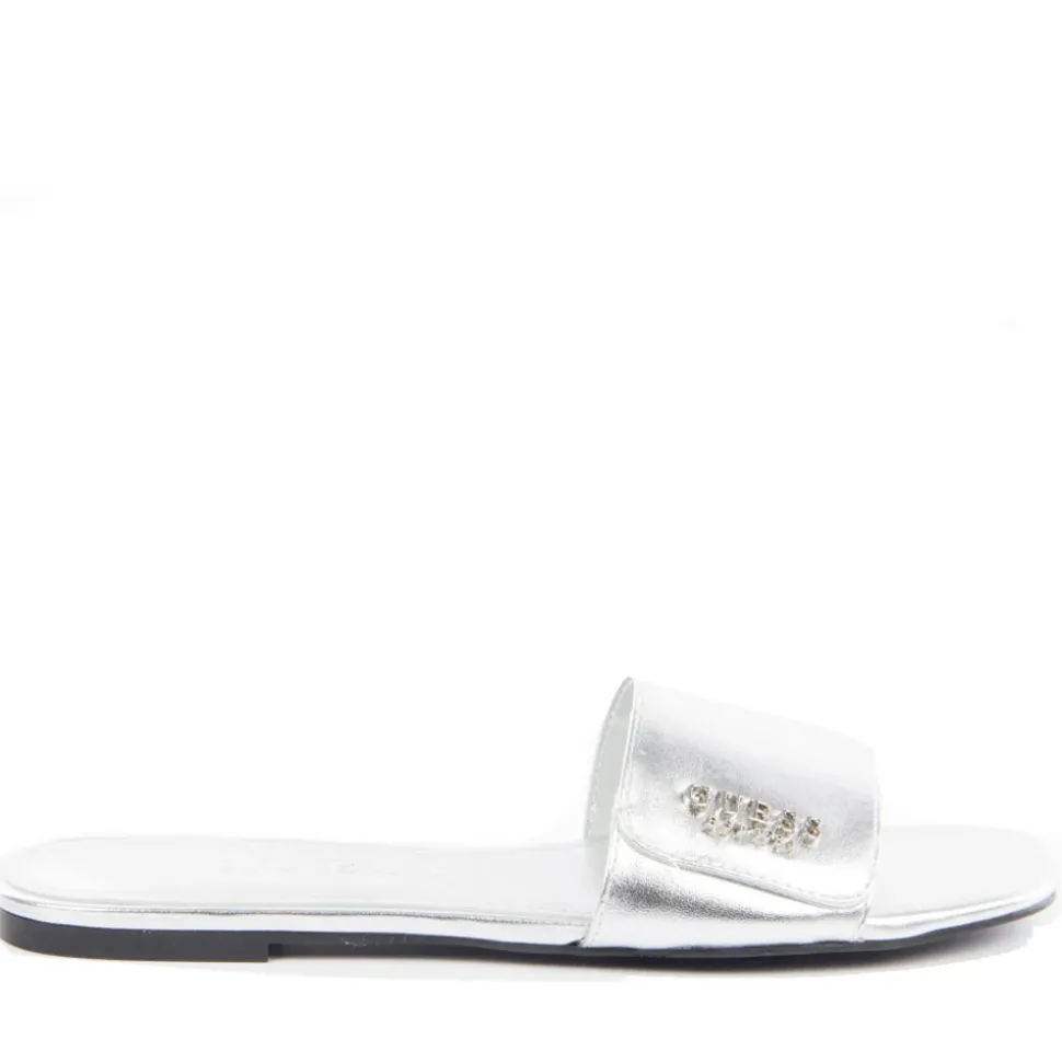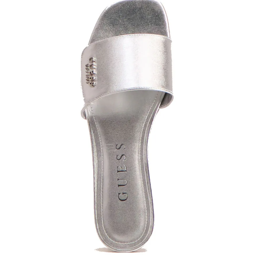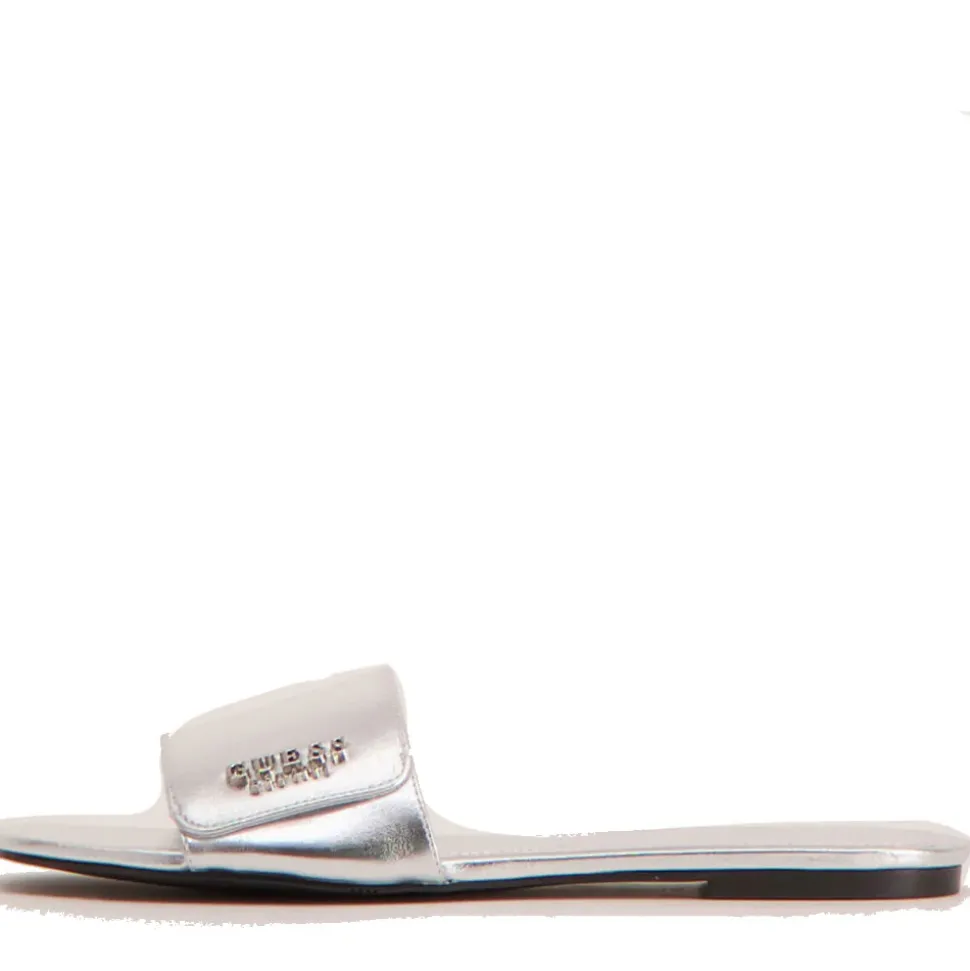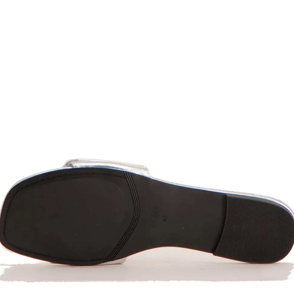 Ciabatte donna Guess in ecopelle lucida linea Jodalee colore Silver. Logo frontale applicato. Punta quadrata.