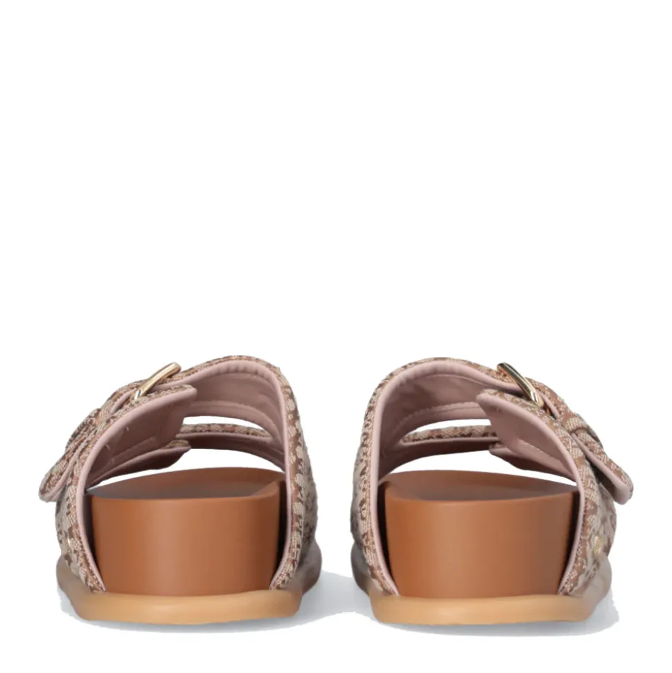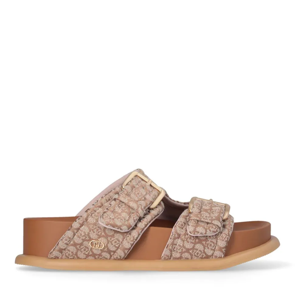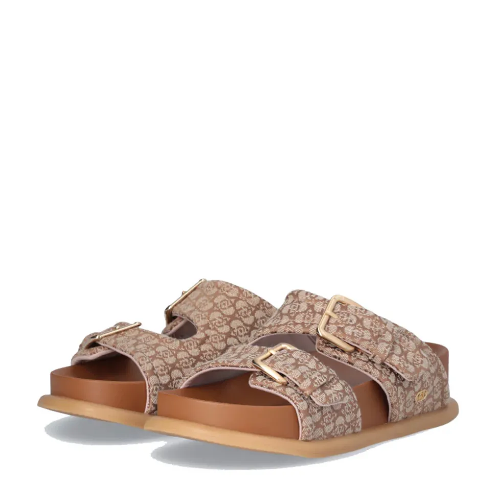 Sandali con fascette bold in denim monogram con fibbie regolabili. Borchietta con logo monogram. Fussbett anatomico.