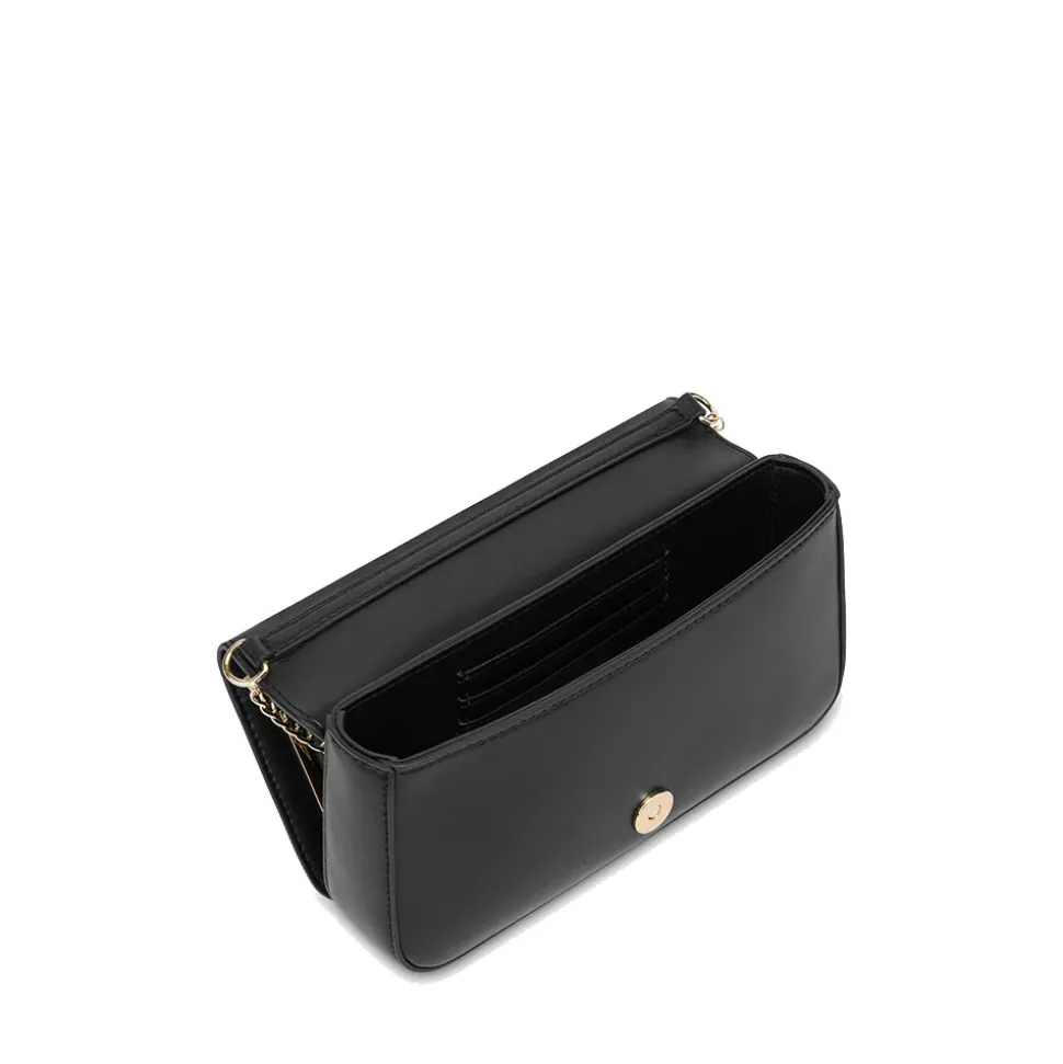 Borsa in ecopelle chiusa con pattina e clip magnetica. Logo Lettering in galvanica oro sul davanti. Tracolla a catena.