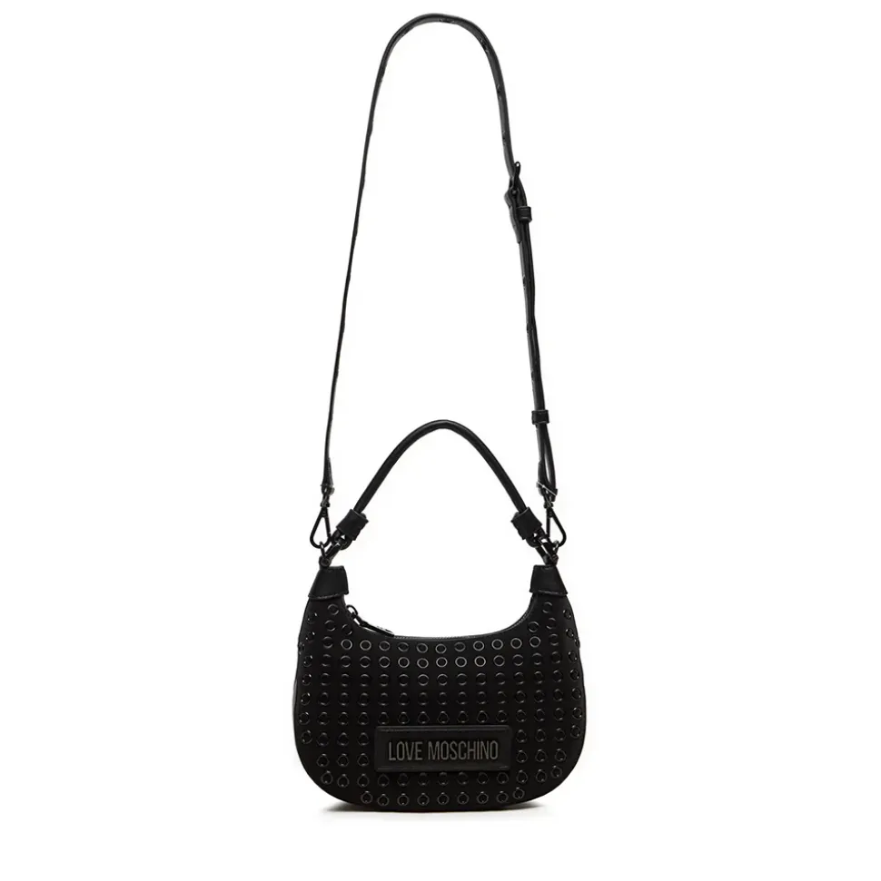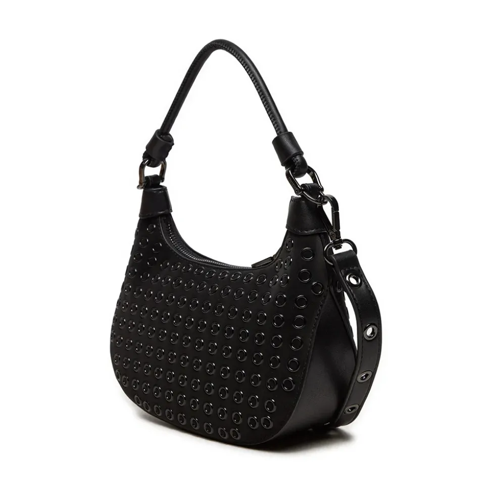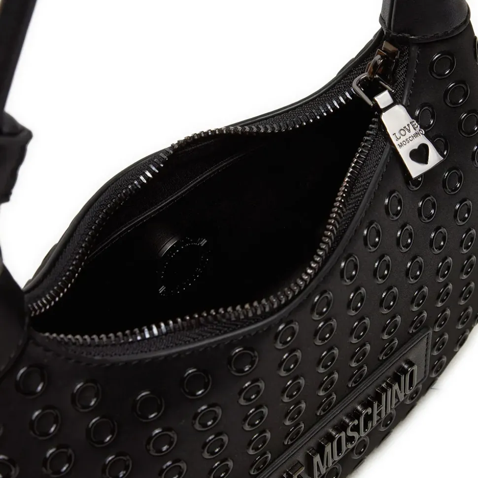 Hobo bag in ecopelle nera chiusa con zip. Decorazione con occhielli all over. Logo Lettering in metallo applicato sul davanti. Tracolla regolabile con occhielli e fibbia in metallo.