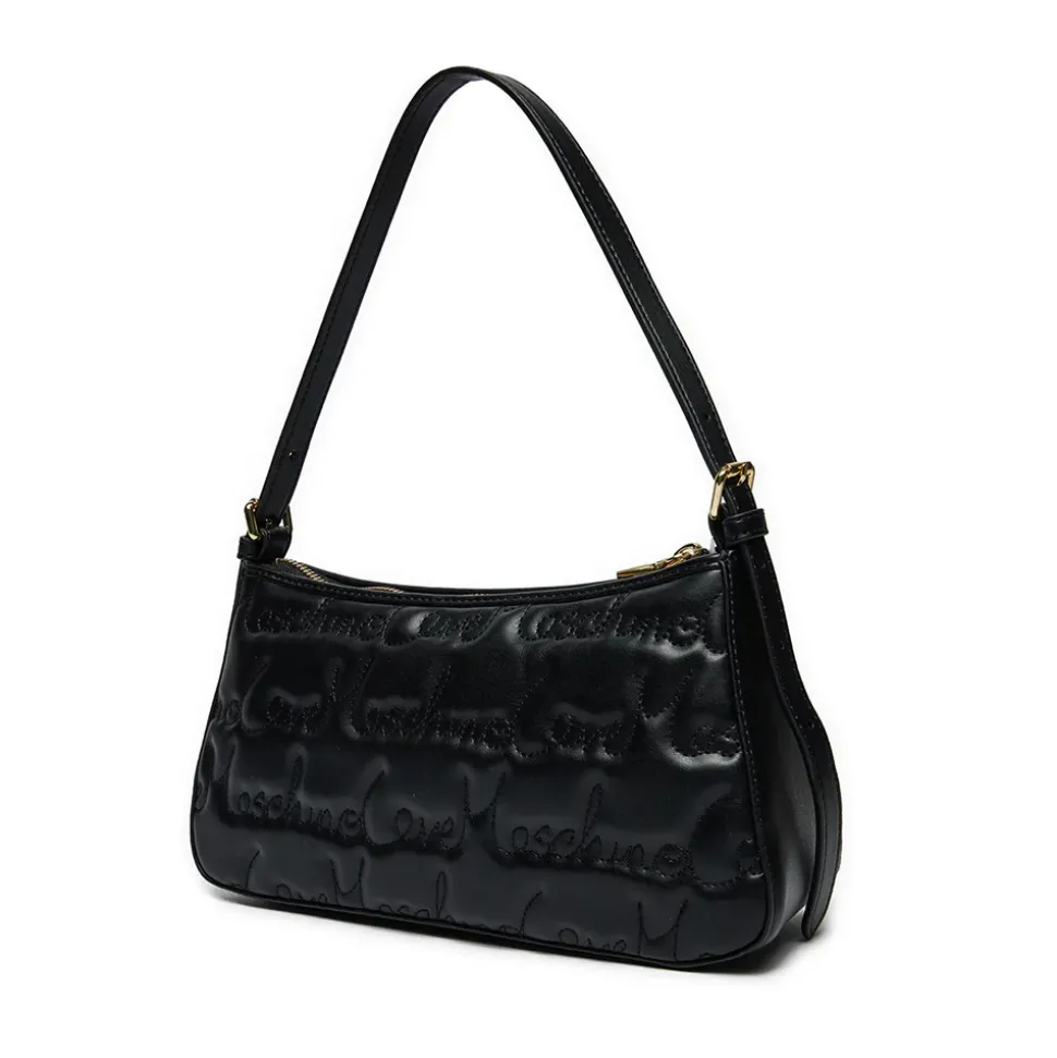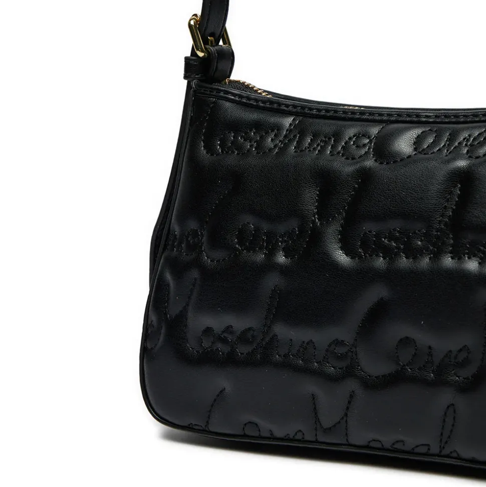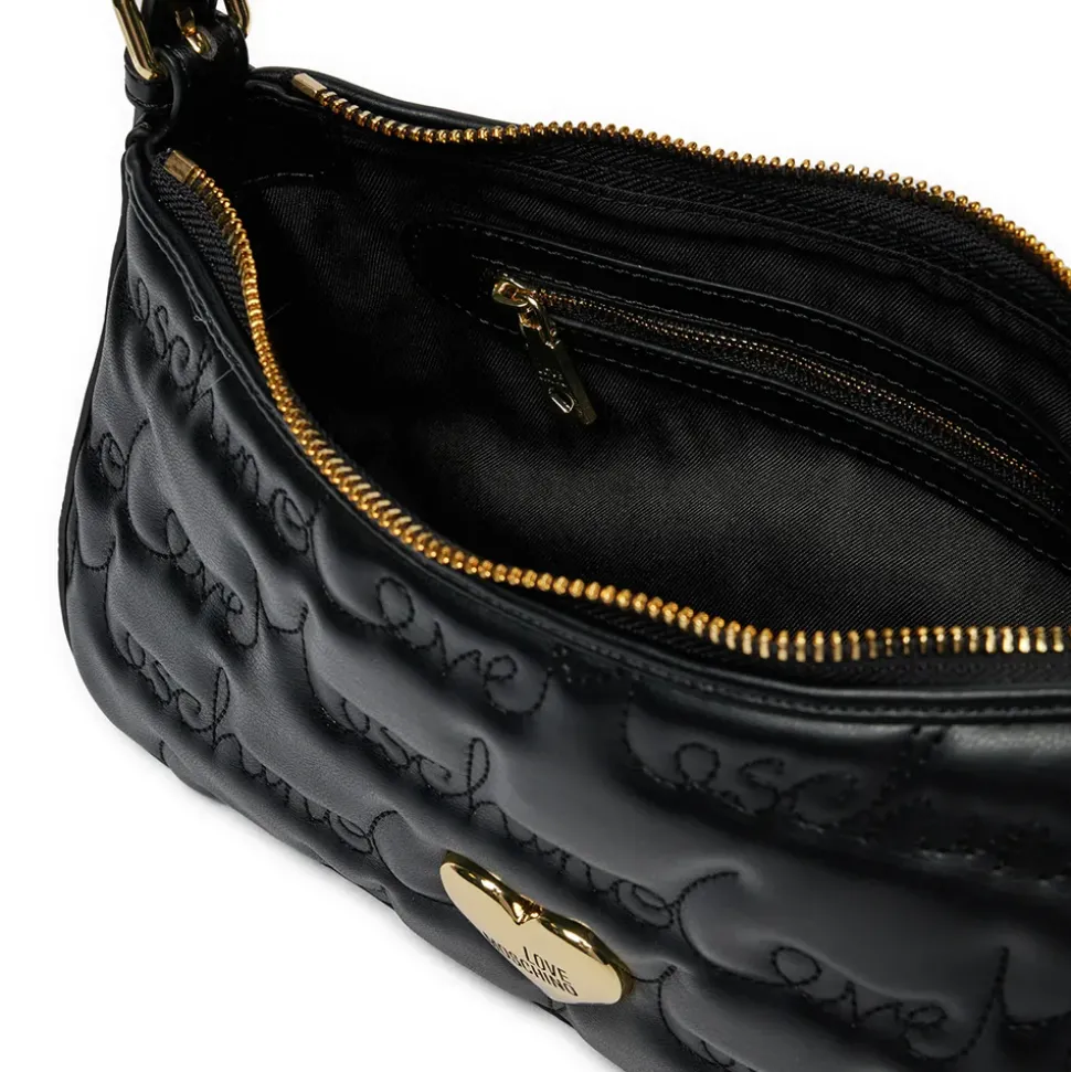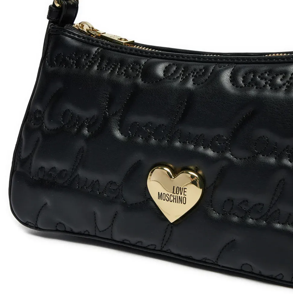 Borsa in ecopelle ricamata chiusa con zip. Cuore con logo frontale. Manico regolabile con fibbia.