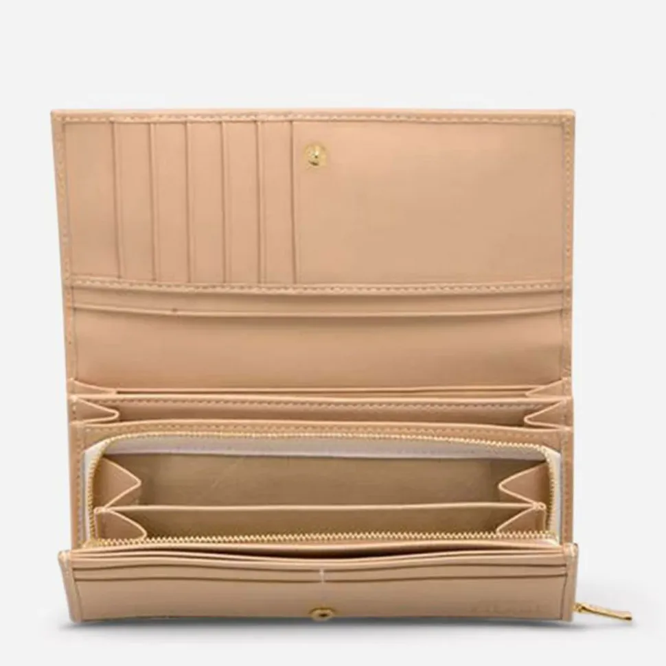 Interno: 10 fessure per carte di credito, 3 scomparti per ricevute, 2 tasche per banconote, portamonete con zip