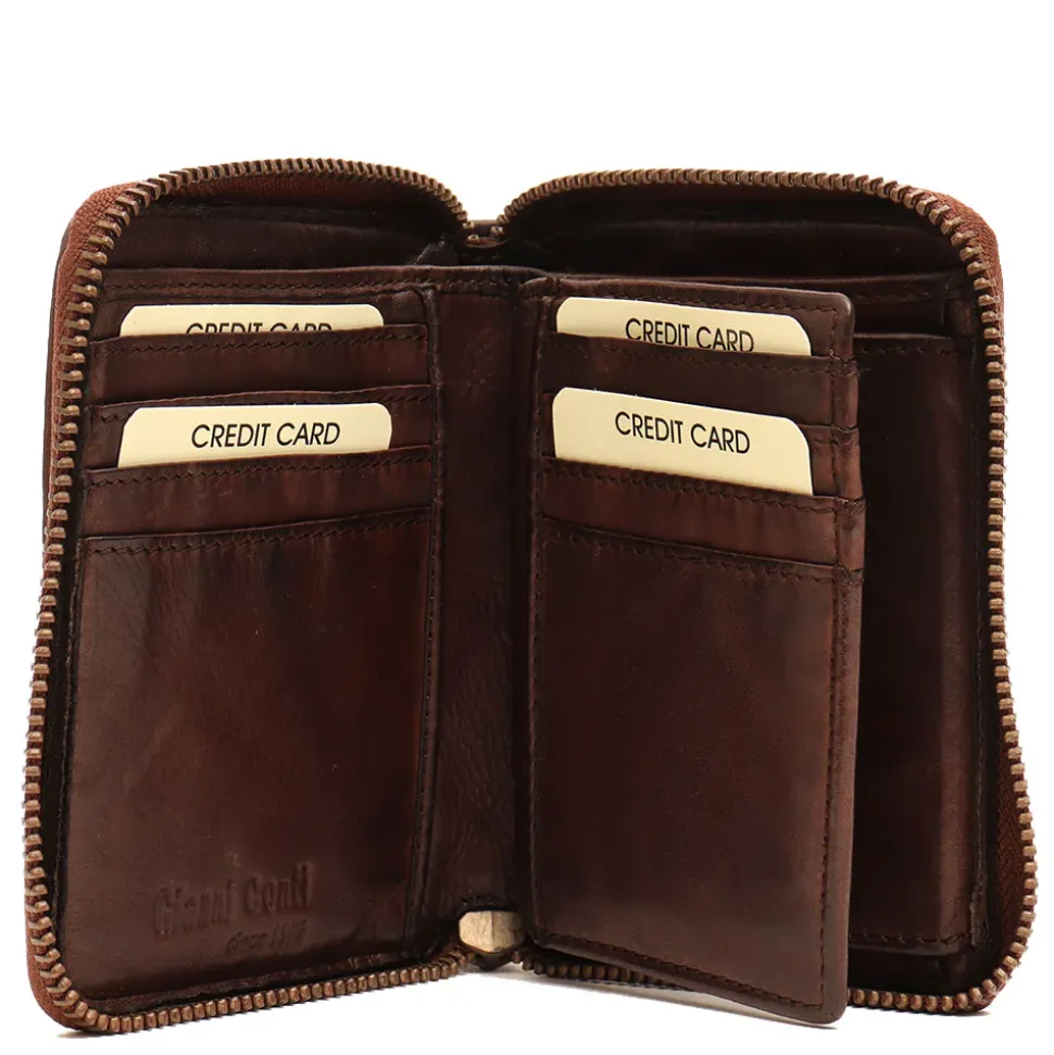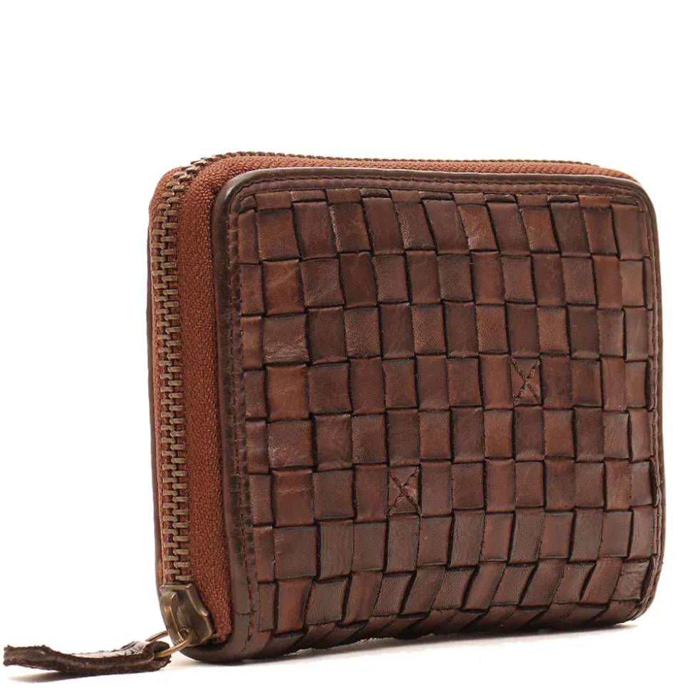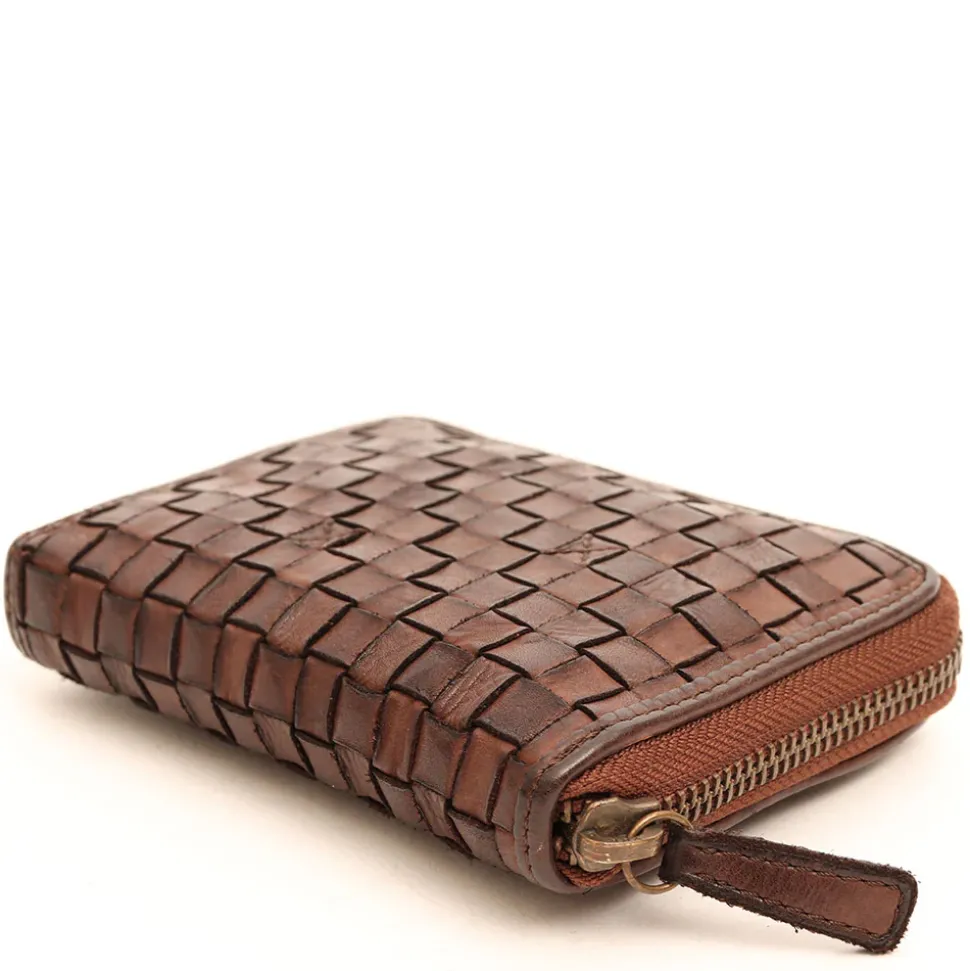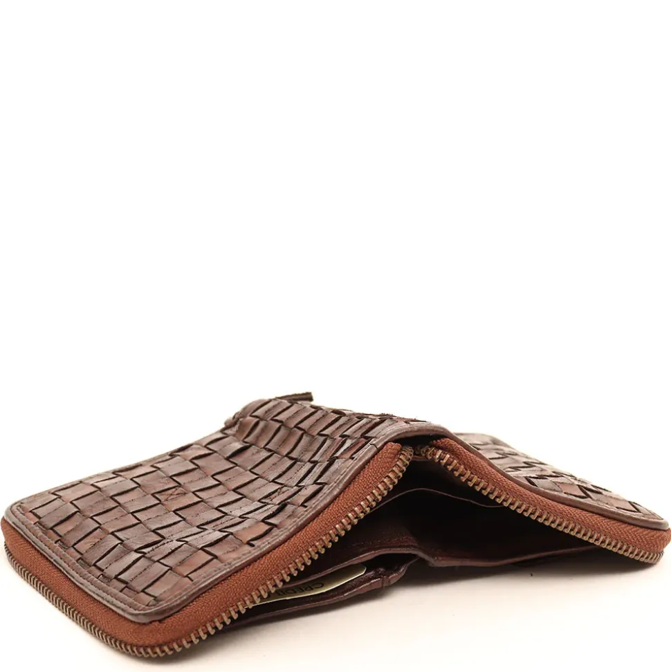 Portafoglio donna zip around Gianni Conti in pelle intrecciata marrone.