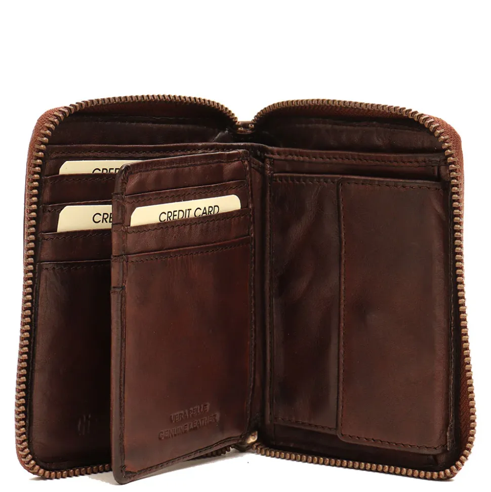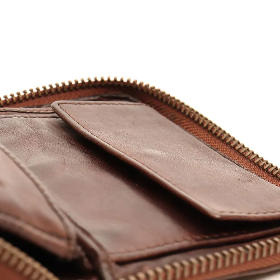 Portafoglio in pelle chiuso con zip con ampio spazio per tessere, documenti e banconote. Portamonete interno chiuso con clip.