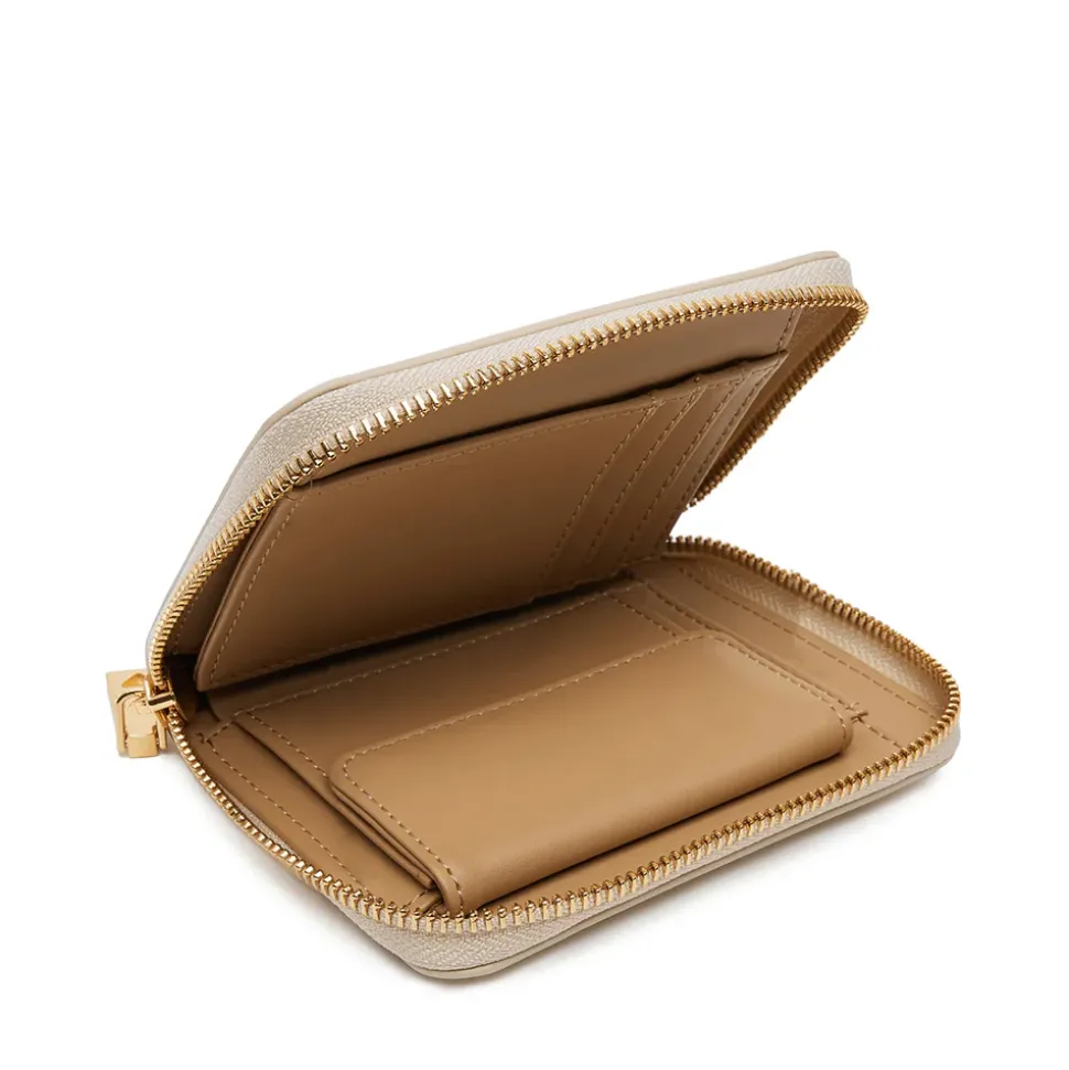 Portafoglio zip around con interno foderato con pattina portatessere e documenti. Sei tasche interne a fessura. Logo dorato frontale.