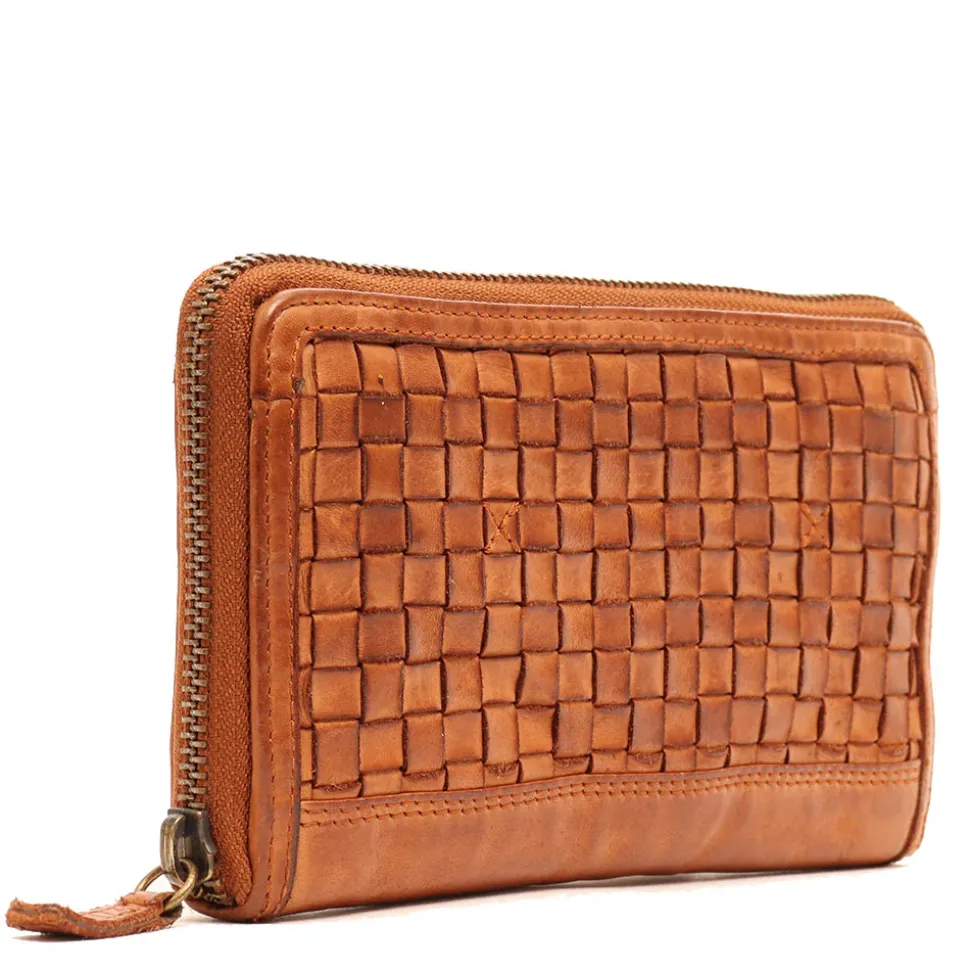 Portafoglio donna zip around Gianni Conti in pelle intrecciata color cognac.