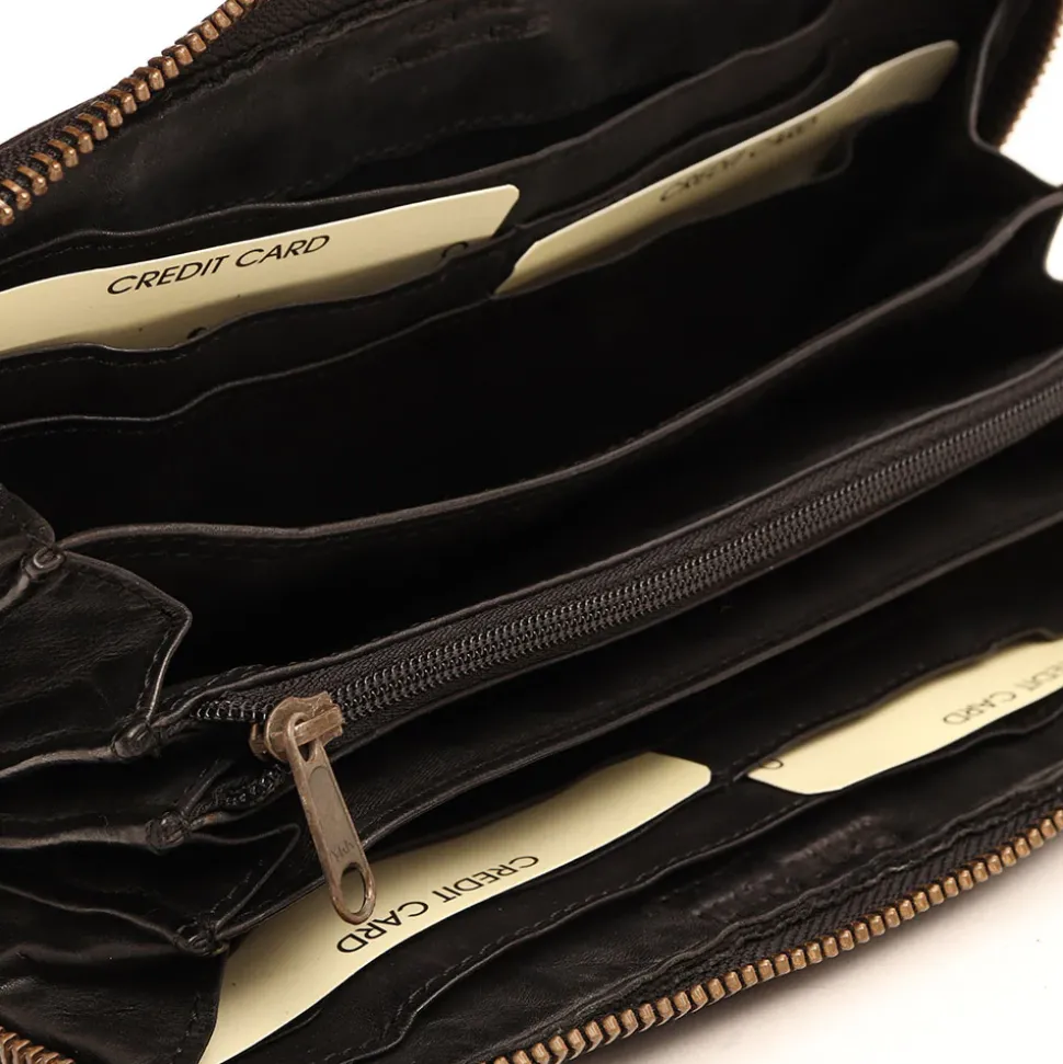 Portafoglio in pelle chiuso con zip con ampio spazio per tessere, documenti e banconote. Portamonete interno chiuso con zip.