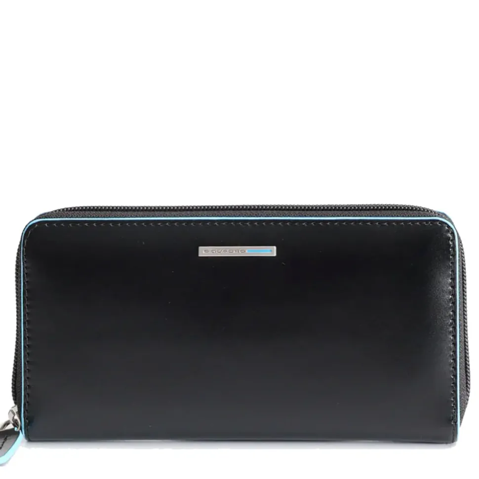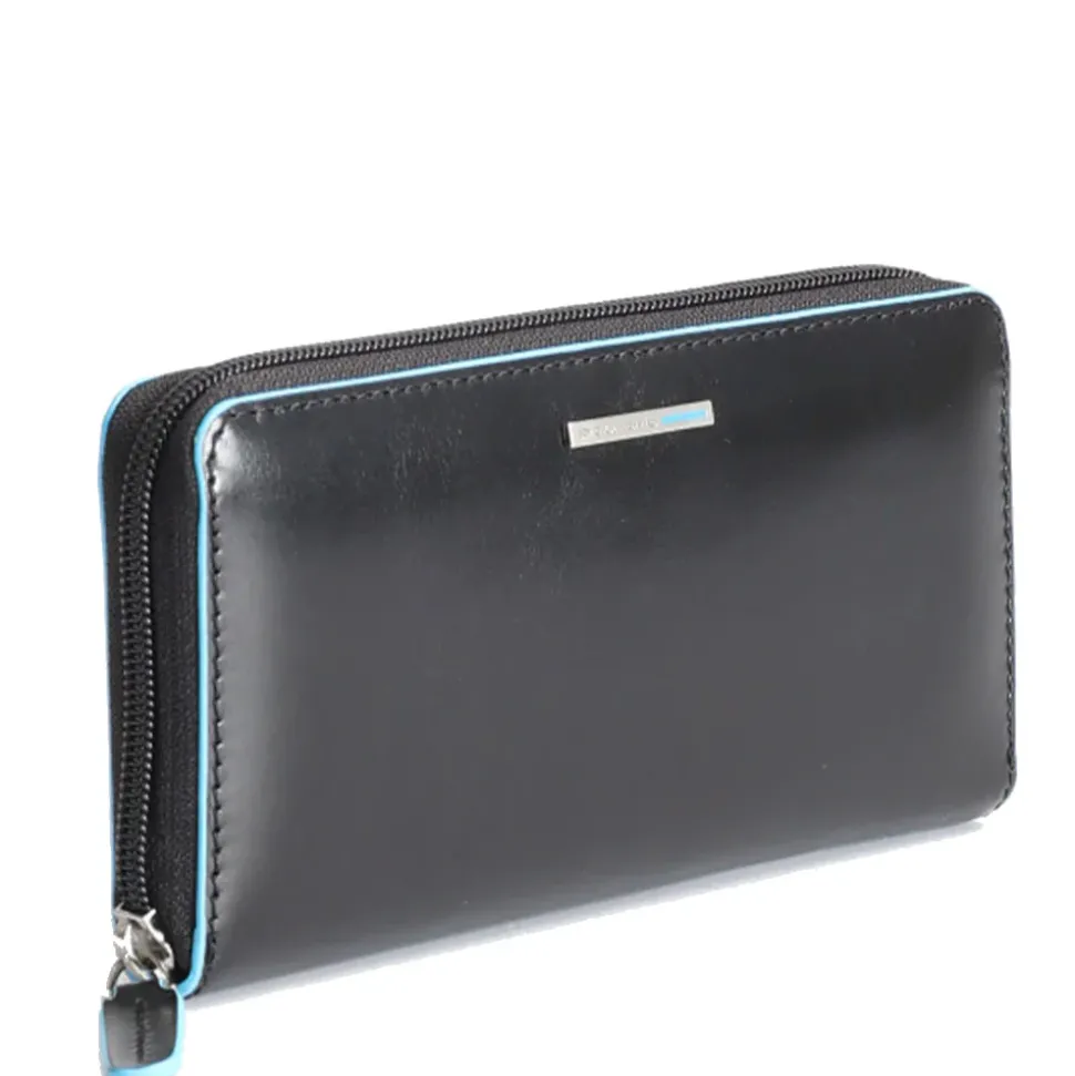 Portafoglio donna Piquadro linea Blue Square in pelle nera zip around. Portamonete chiuso con zip, 12 fessure per carte di credito.
