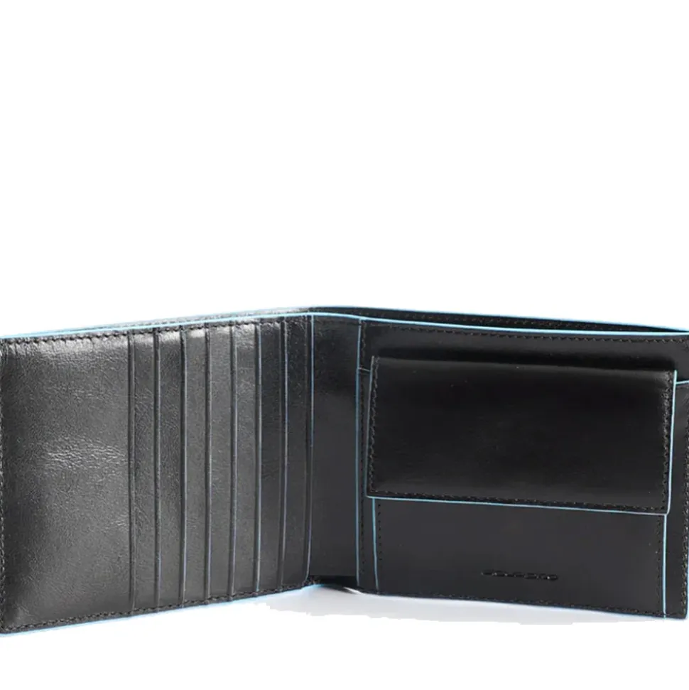 Portafoglio uomo in pelle Piquadro linea Blue Square. 7 fessure per tessere. 2 tasche porta banconote e 2 tasche porta documenti. Sistema RFID protezione carte di credito. Portamonete interno chiuso con clip automatica.