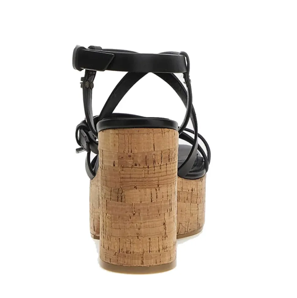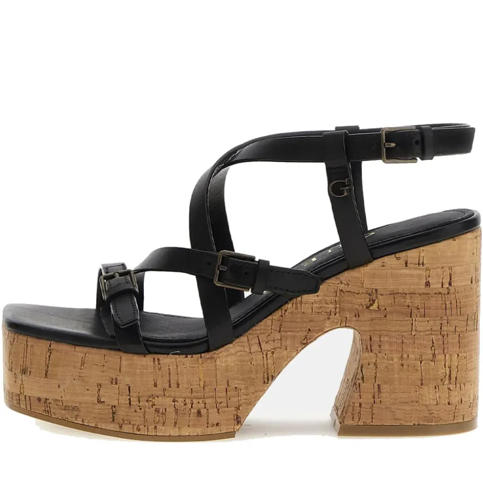 Sandalo con tacco Guess in pelle con fasce frontali intrecciate linea Corke colore nero.