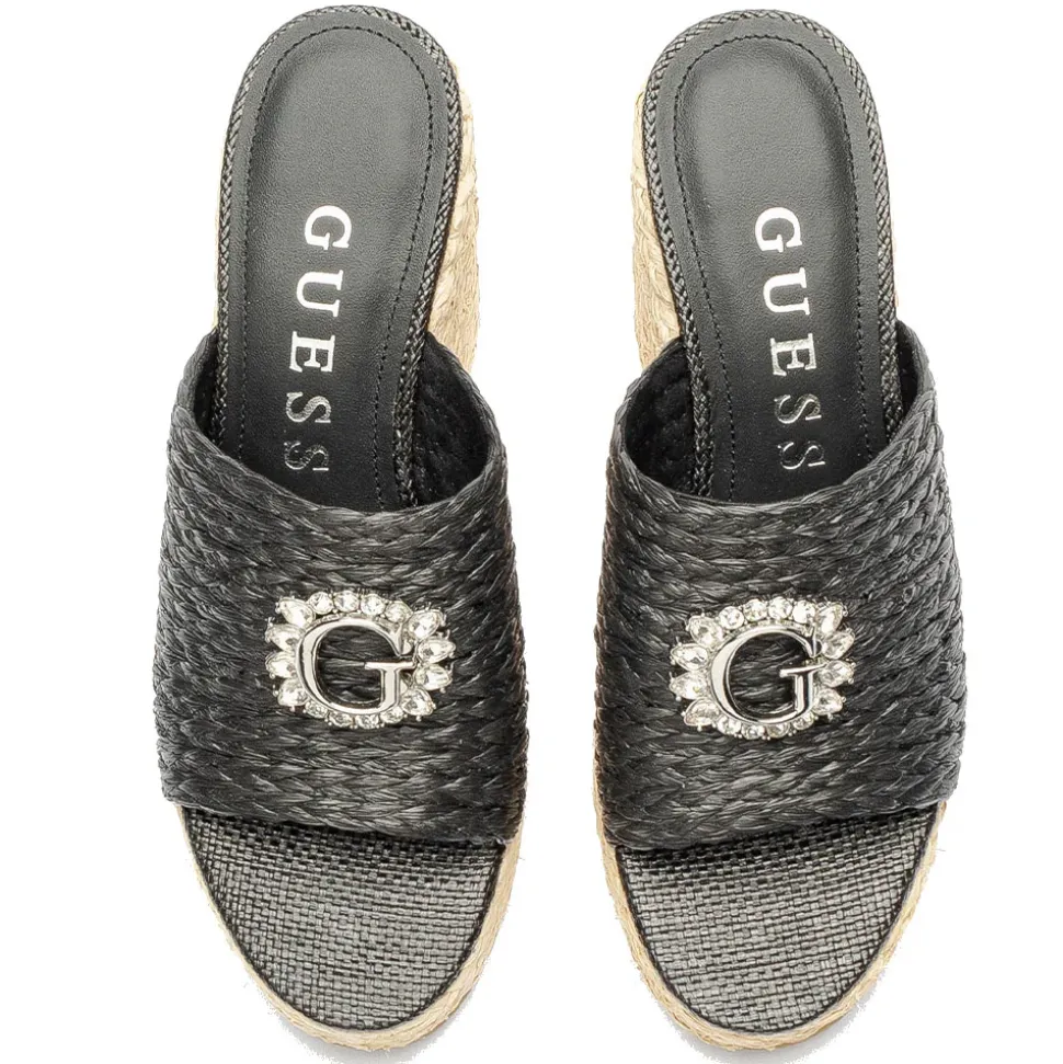 Sandali donna con zeppa in rafia Guess linea Elsia colore nero.