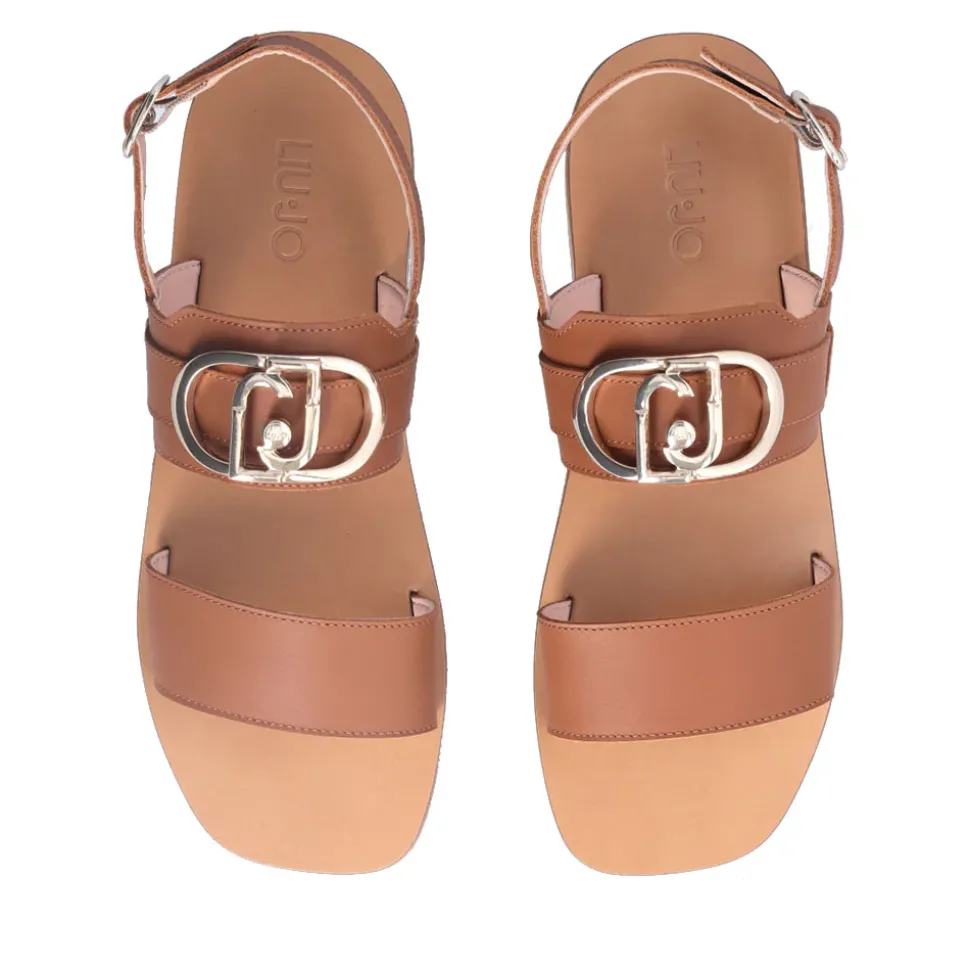 Sandali flat in pelle. Modello a due fascette. Maxi logo applicato. Chiusura con cinturino regolabile alla caviglia. Made in Italy.
