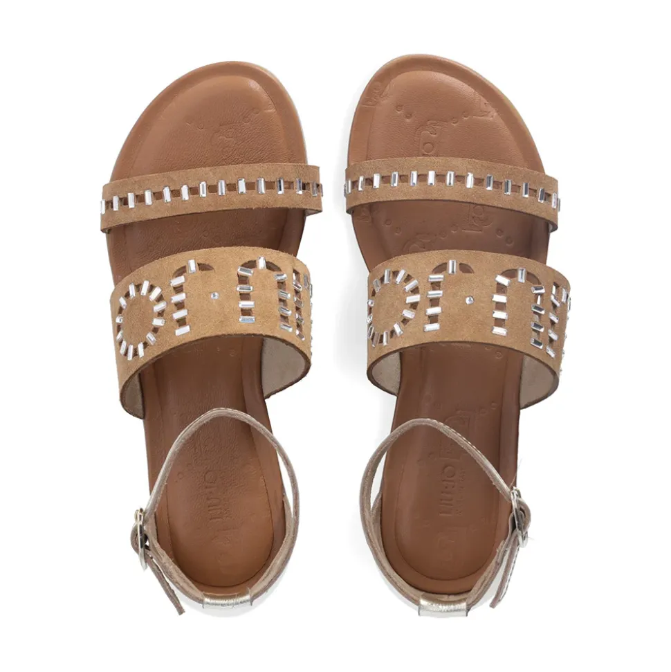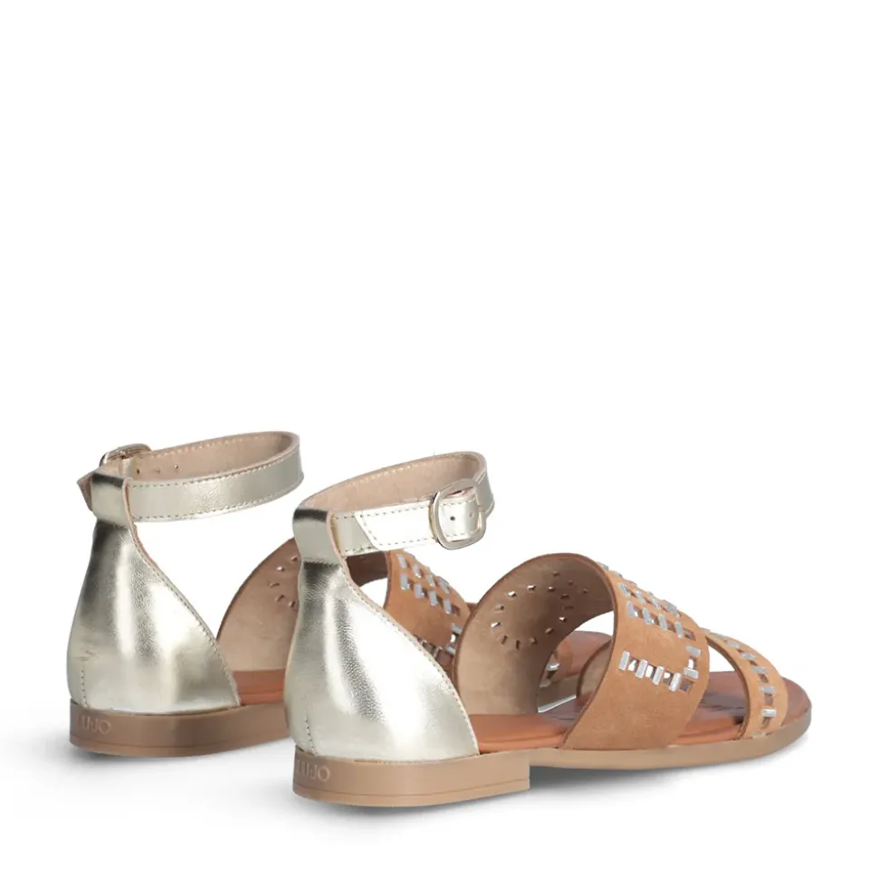Sandali flat in suede color cognac con inserti metallizati. Maxi logo borchiato frontale.