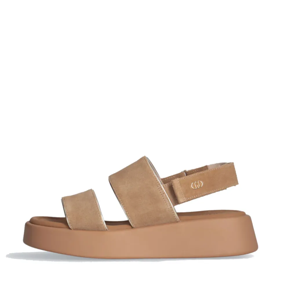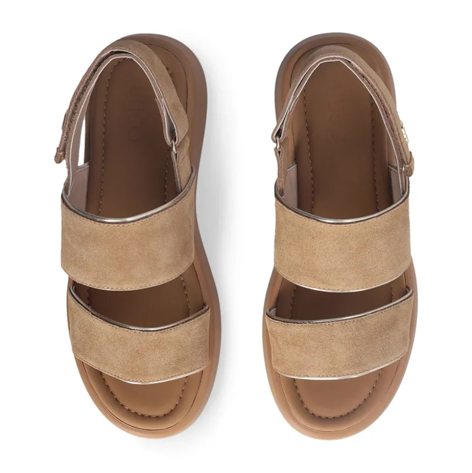 Sandali con fascette in suede e profilo laminato. Borchia logo monogram. Chiusura in velcro. Suola platform.