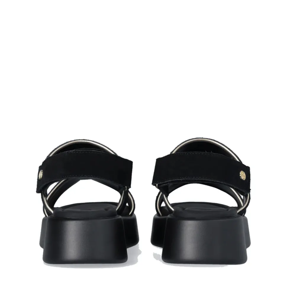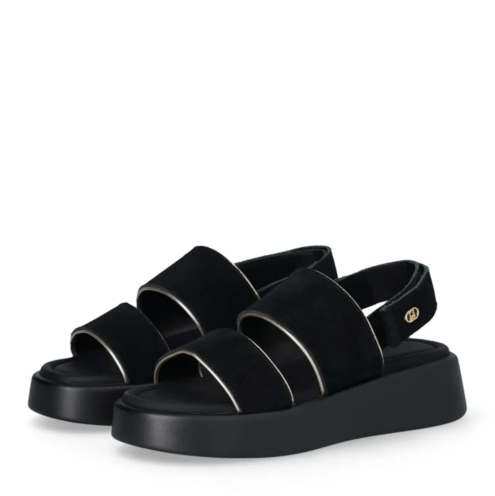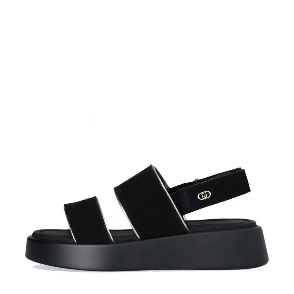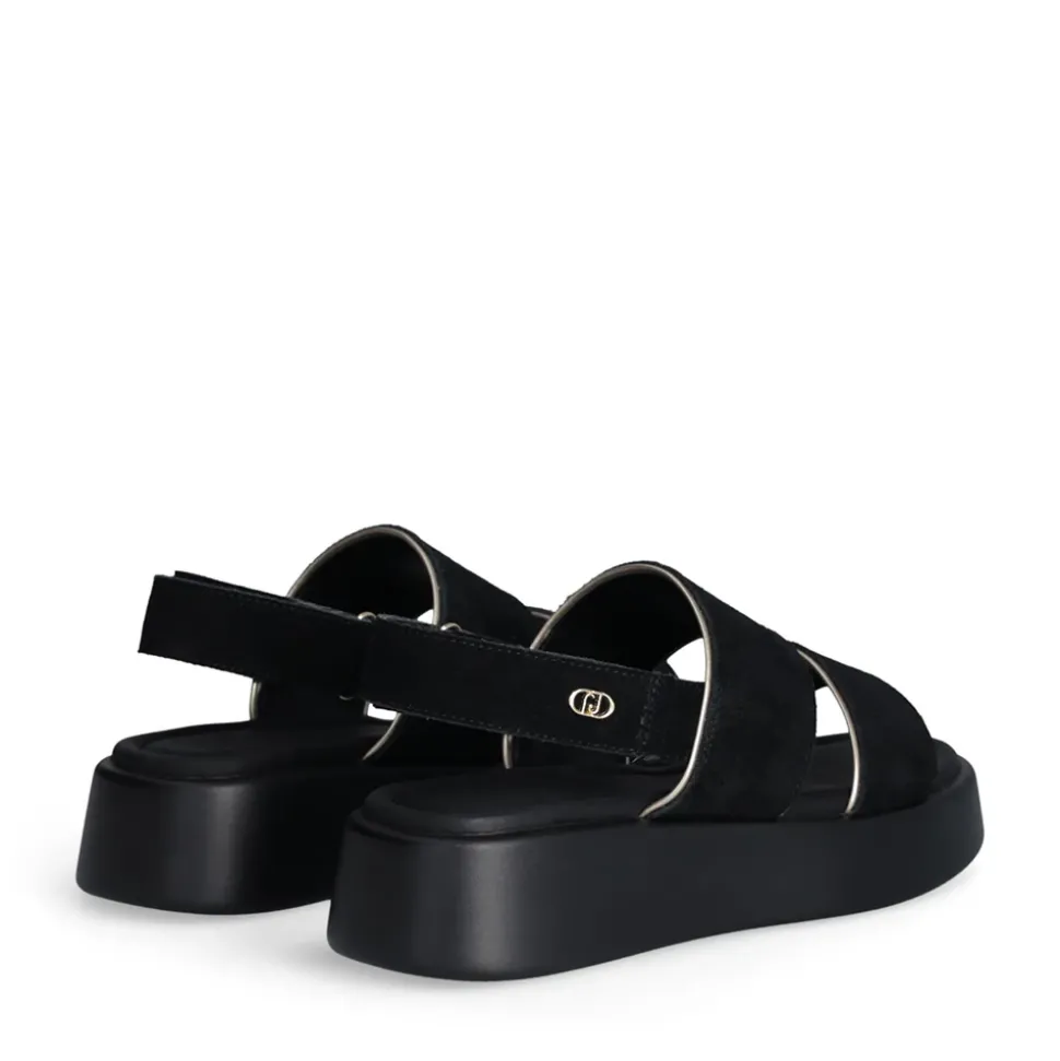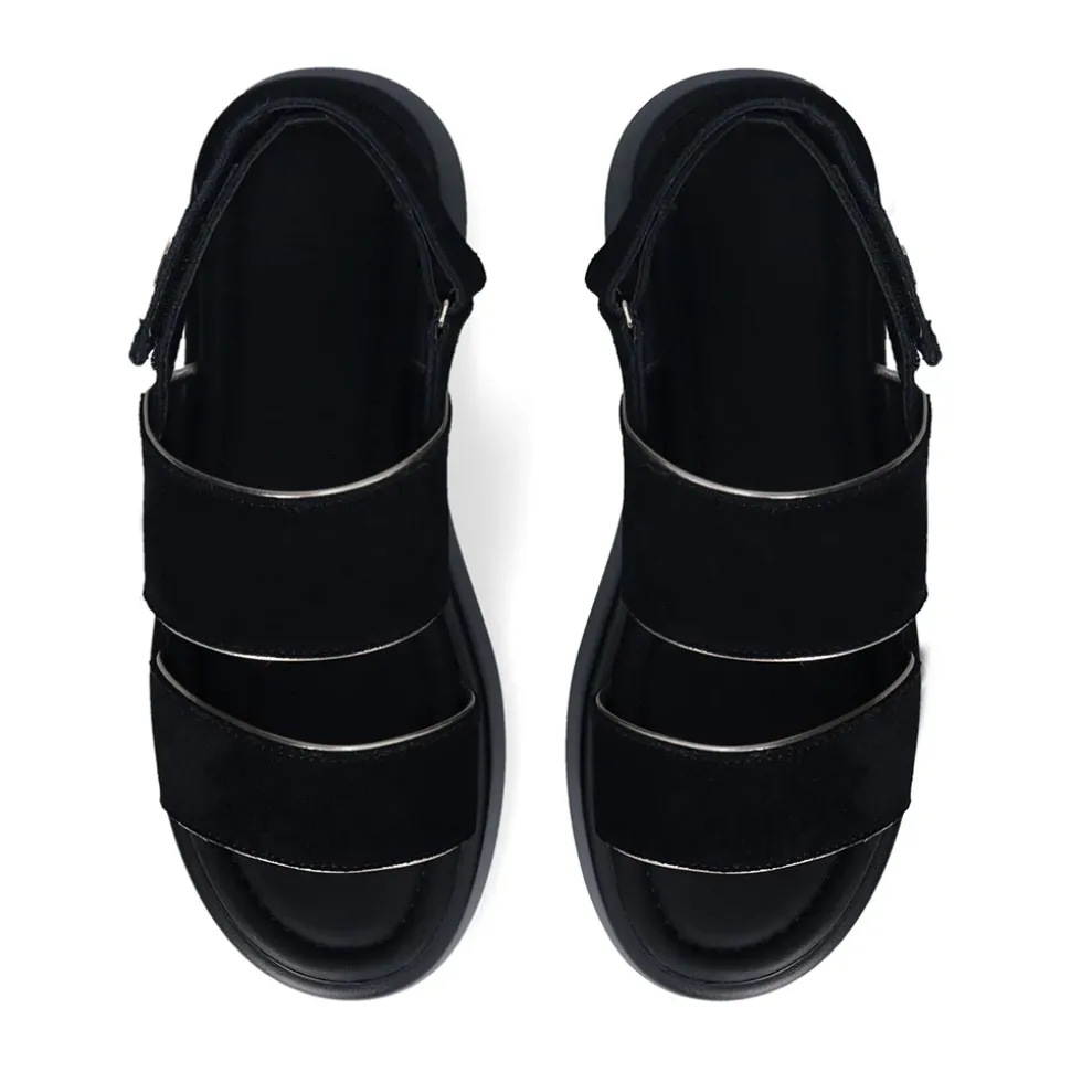 Sandali con fascette in suede e profilo laminato. Borchia logo monogram. Chiusura in velcro. Suola platform.