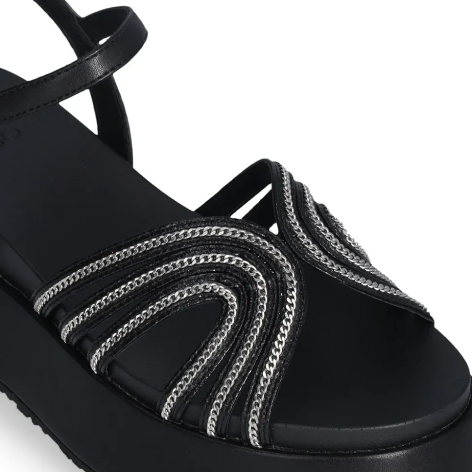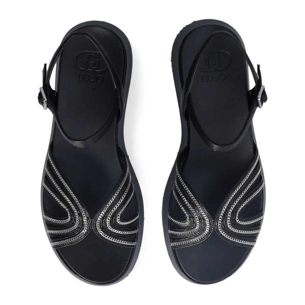 Sandali con tomaia laminata e dettaglio chain sul davanti. Chiusura con cinturino regolabile. Borchia con logo monogram. Suola platform.