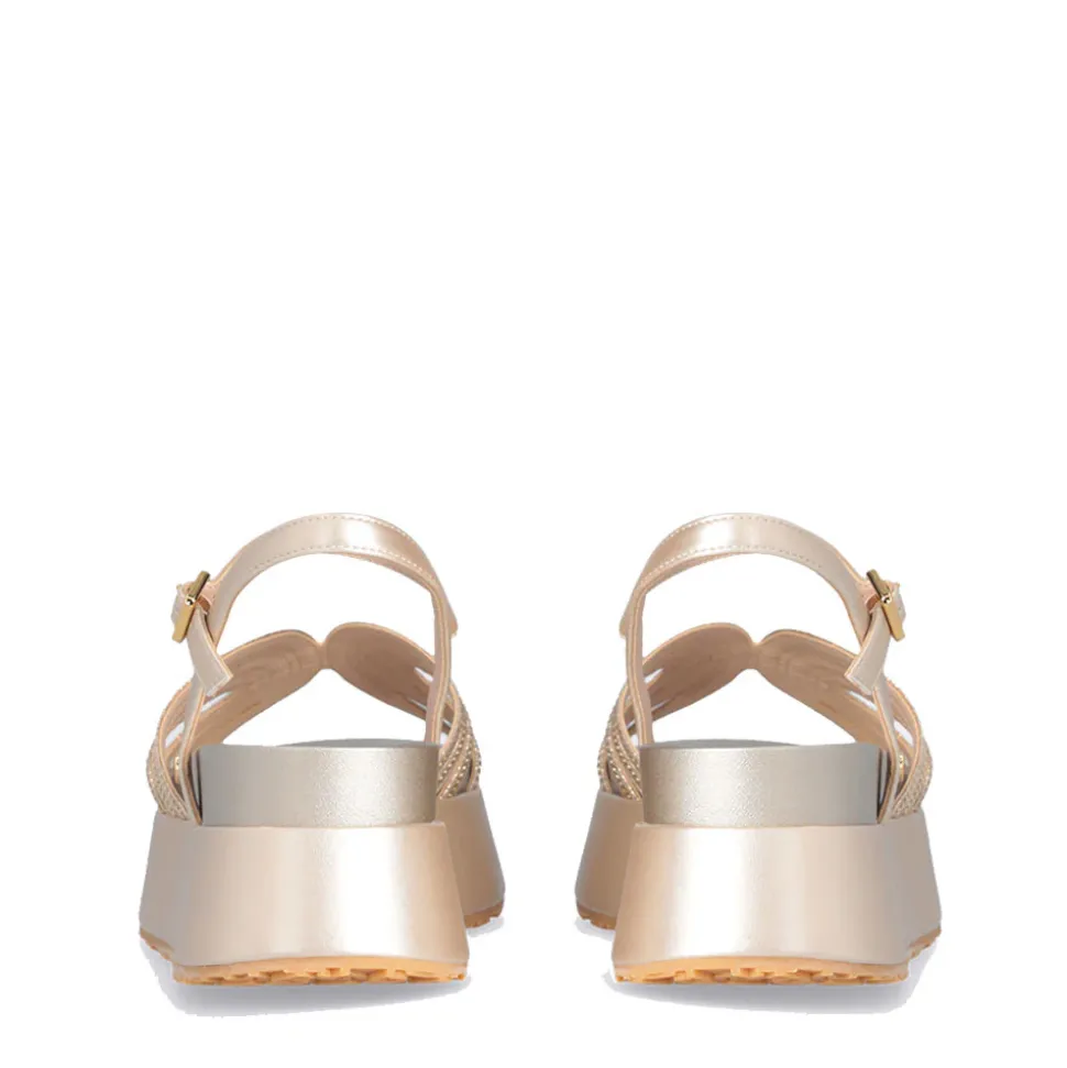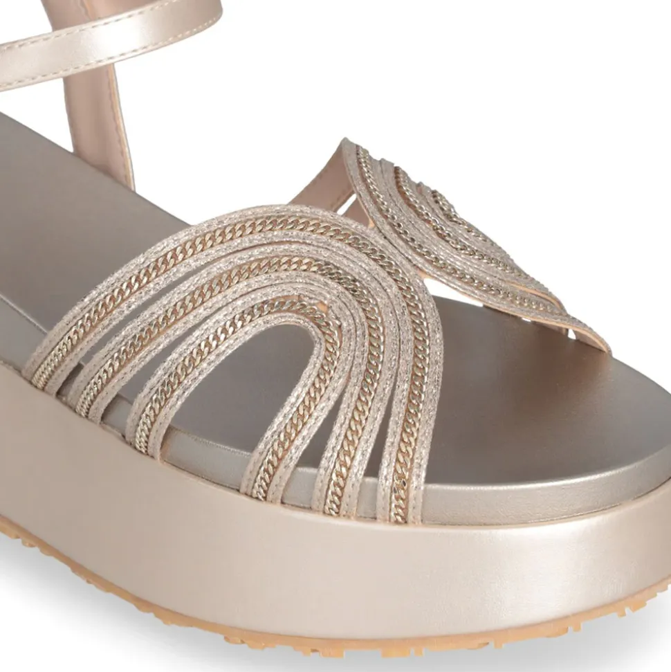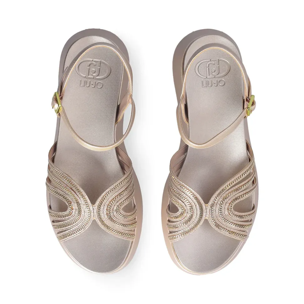 Sandali con tomaia laminata e dettaglio chain sul davanti. Chiusura con cinturino regolabile. Borchia con logo monogram. Suola platform.