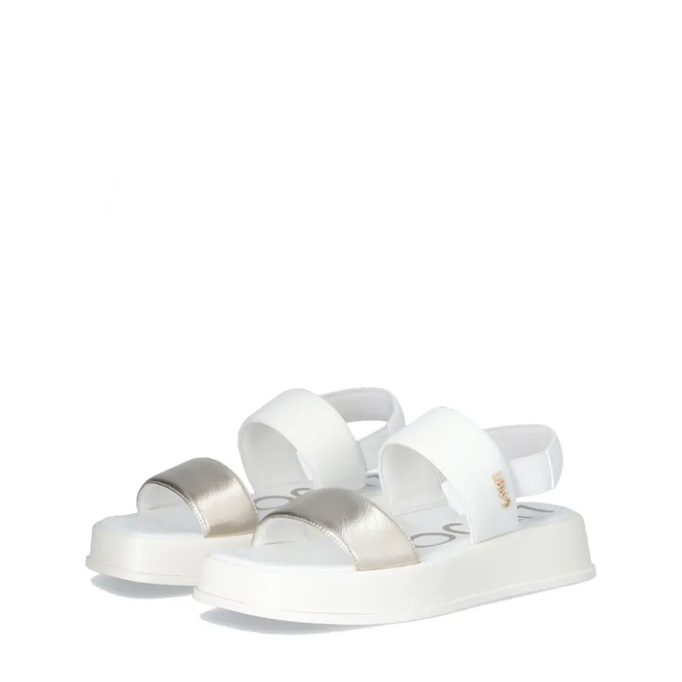 Sandali fascette effetto bold con inserti metallizzati. Logo lettering. Chiusura con inserto elastico. Suola ricoperta ton sur ton.