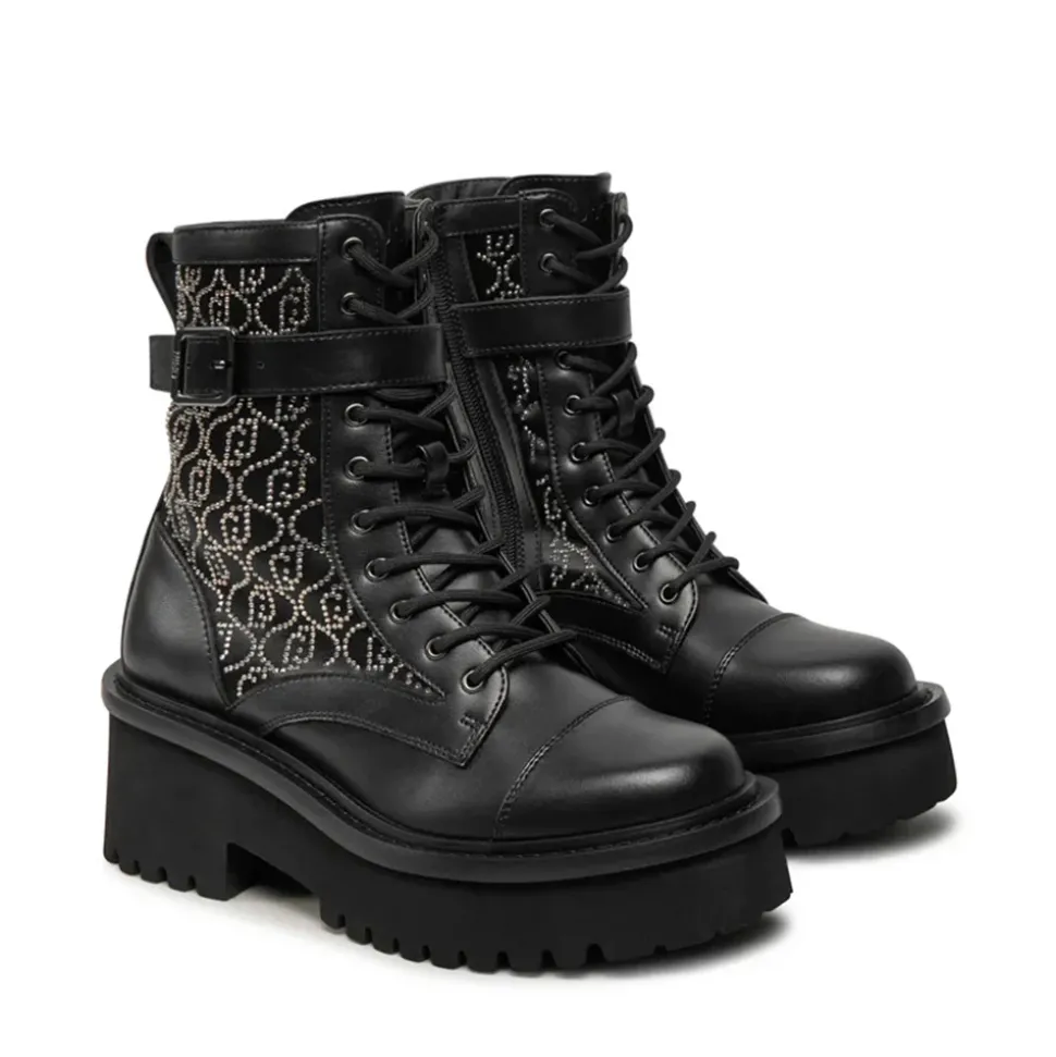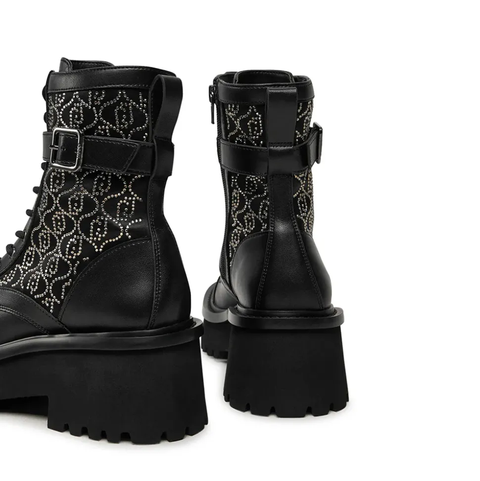 Anfibi con tomaia in ecopelle e inserti in nylon. Logo in strass all over. Chiusura con zip sul lato interno. Suola in gomma con battistrada dentellato.
