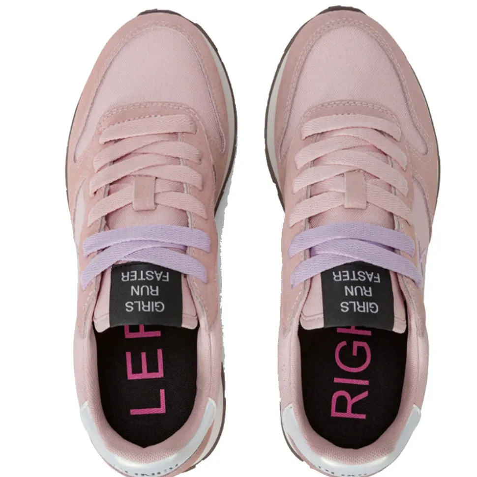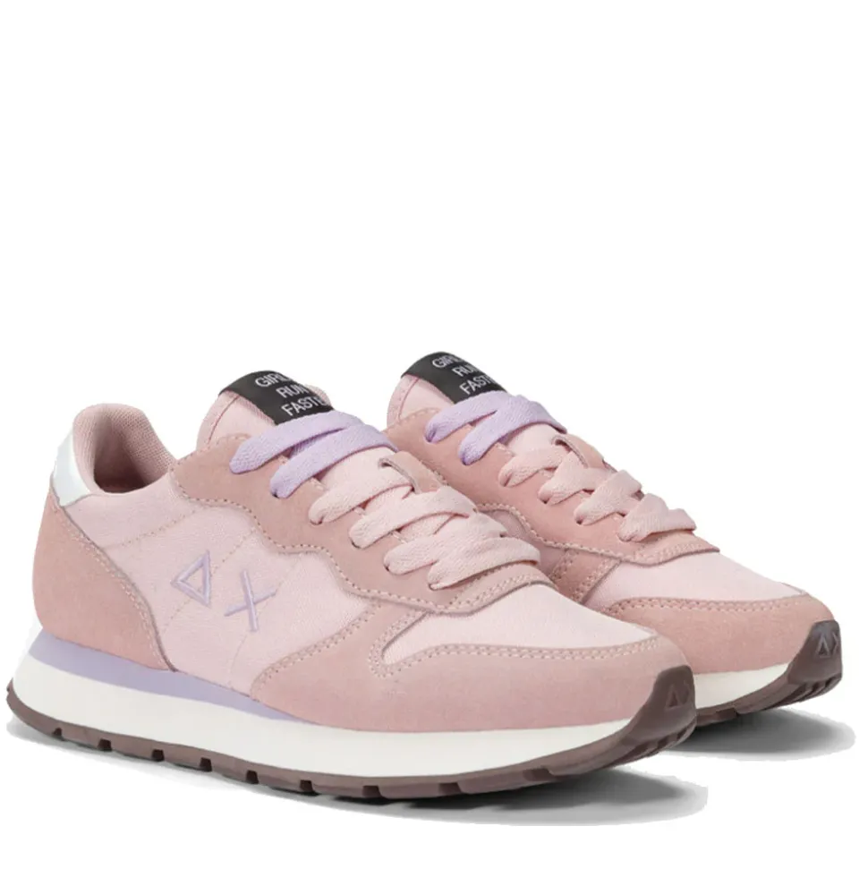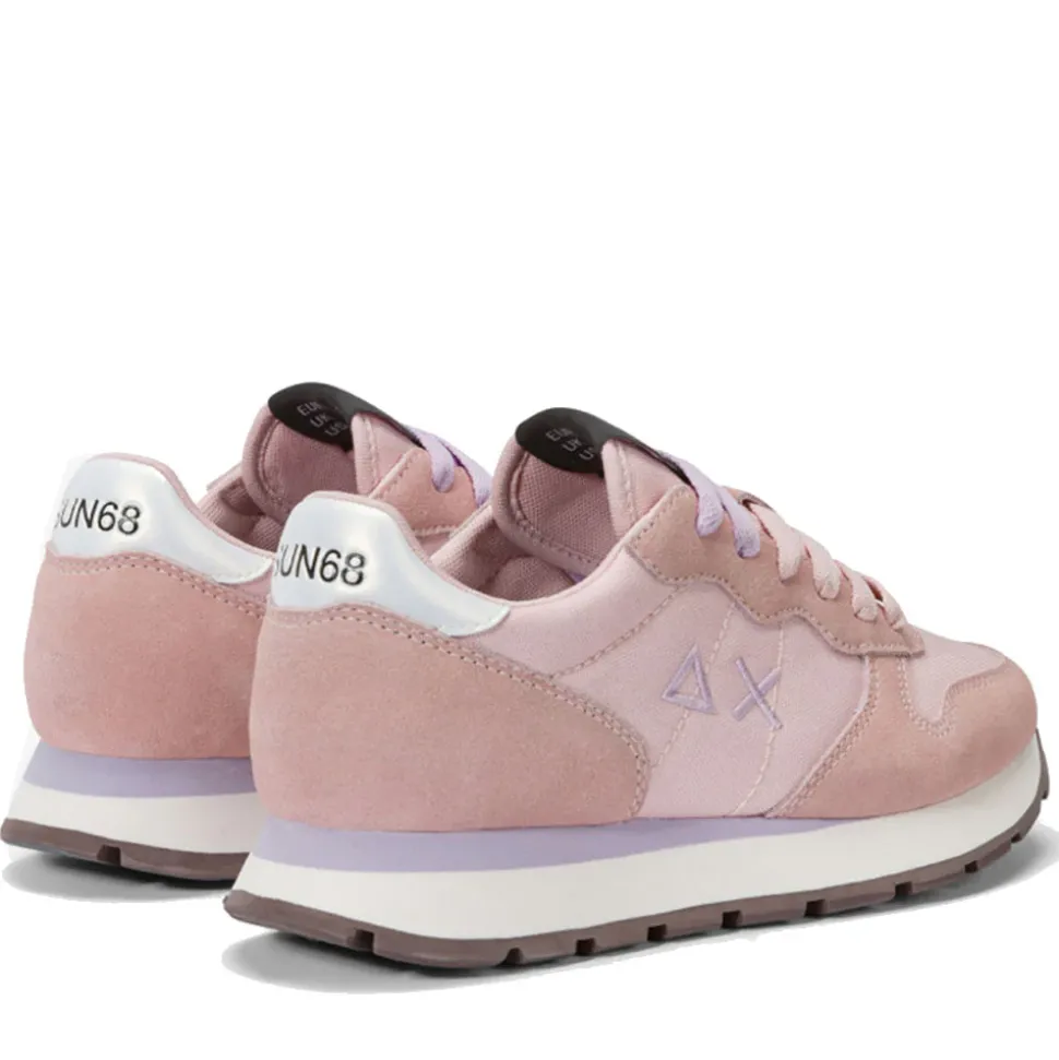 Sneaker Ally Nylon Solid SUN68 realizzate in nylon e camoscio rosa. Logo lilla cucito sul lato, linguetta rosa e tallone con inserto in pelle bianca. Suola in gomma tricolore, altezza 3 cm.