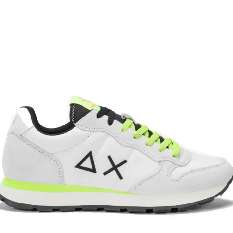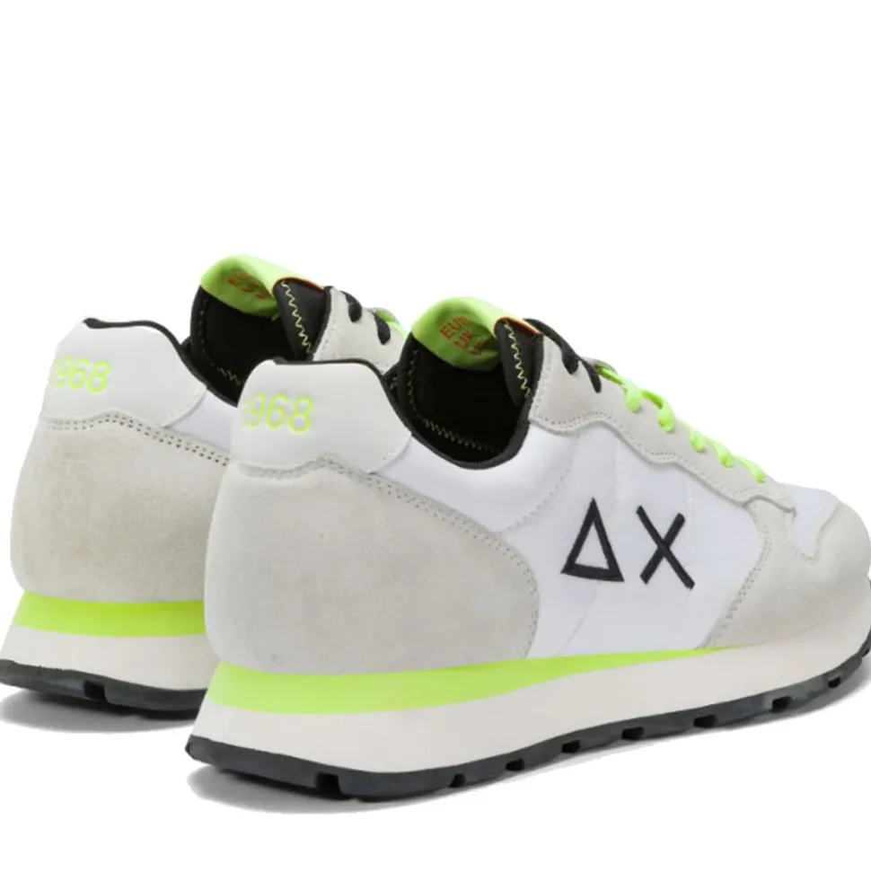 Sneaker Tom Fluo di SUN68 in pelle scamosciata e nylon bianco con inserto in pelle bianca sul retro. Logo nero cucito sul lato e linguetta in mesh. Suola in gomma bianca e giallo fluo, altezza 3 cm.