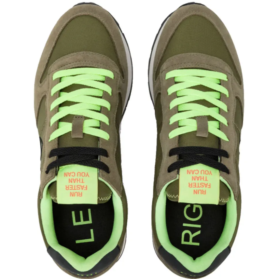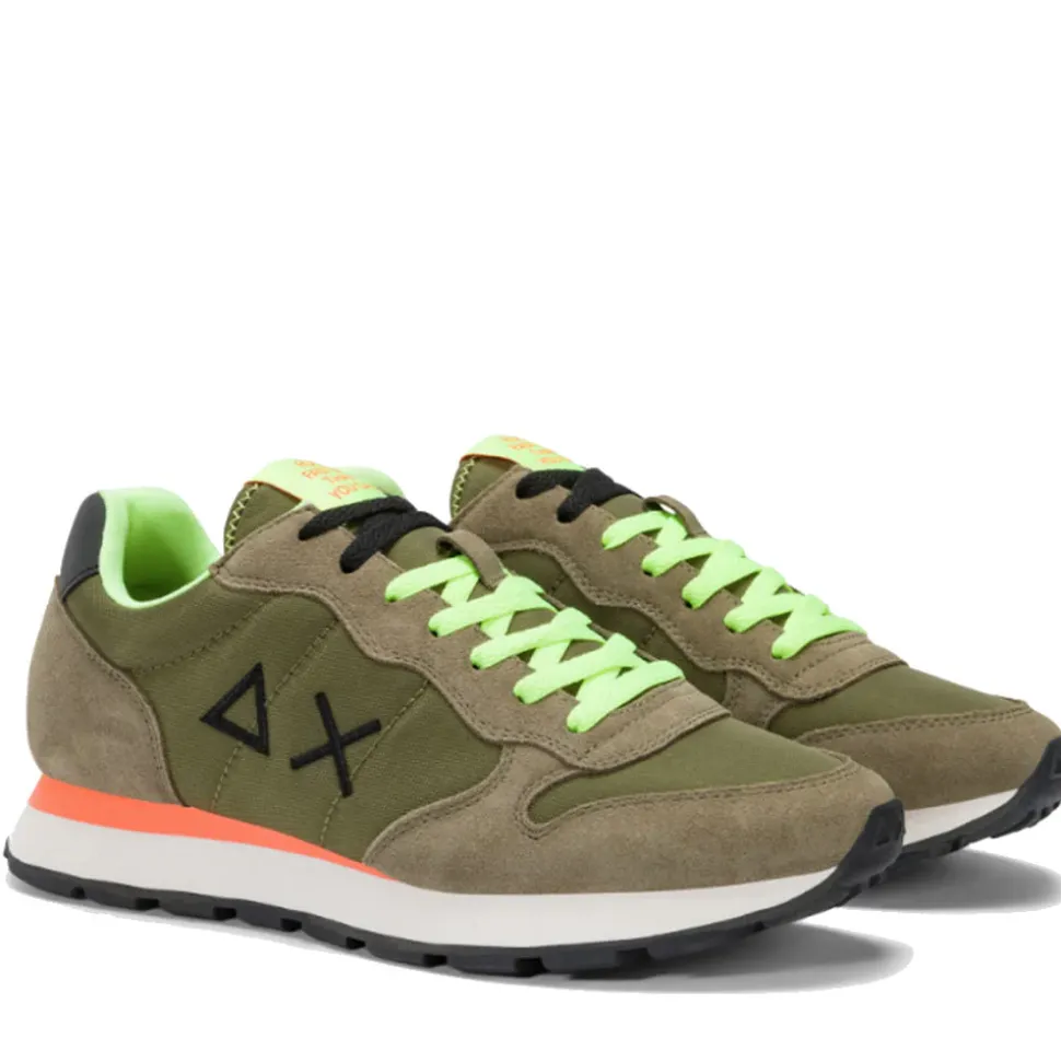 Sneaker Tom Fluo di SUN68 in pelle scamosciata e nylon militare con inserto in pelle nero sul retro. Logo nero cucito sul lato e linguetta in mesh. Suola in gomma bianca e arancione fluo, altezza 3 cm.