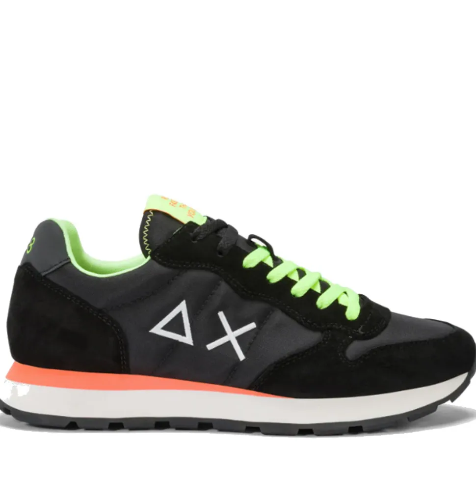 Sneaker Tom Fluo di SUN68 in pelle scamosciata e nylon nero con inserto in pelle nero sul retro. Logo bianco cucito sul lato e linguetta in mesh. Suola in gomma bianca e arancione fluo, altezza 3 cm.