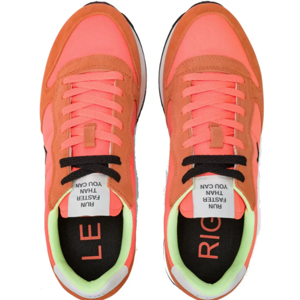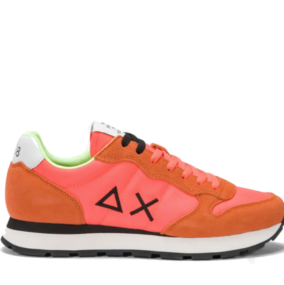 Le scarpe Sun68 Running Tom Solid Arancio Fluo sono realizzate con una tomaia, sulla quale è ricamato il logo Sun68, in nylon nero e inserti in pelle scamosciata mentre l’intersuola in Eva in grado di garantire stabilità e performance si presenta con una doppia veste di colori: nero e bianco.