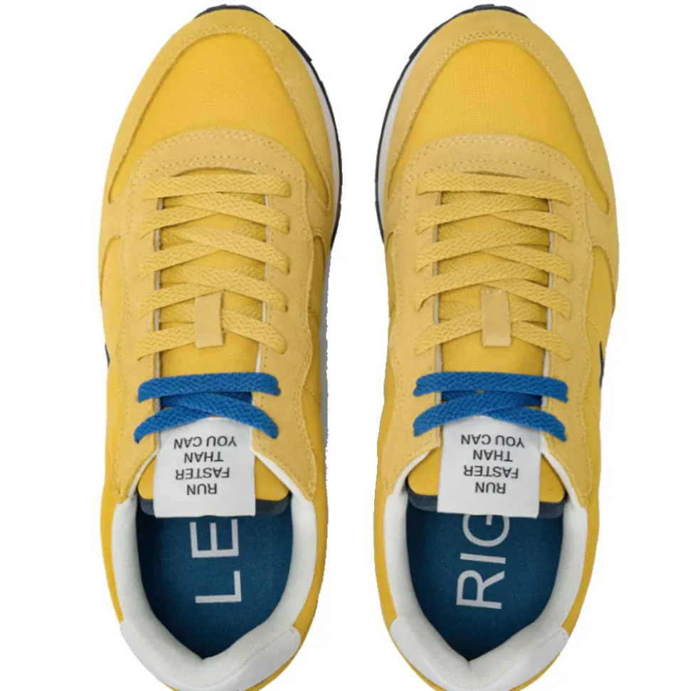 Le scarpe Sun68 Running Tom Solid Giallo sono realizzate con una tomaia, sulla quale è ricamato il logo Sun68, in nylon blu e inserti in pelle scamosciata mentre l’intersuola in Eva in grado di garantire stabilità e performance si presenta con una doppia veste di colori: blu e bianco.
