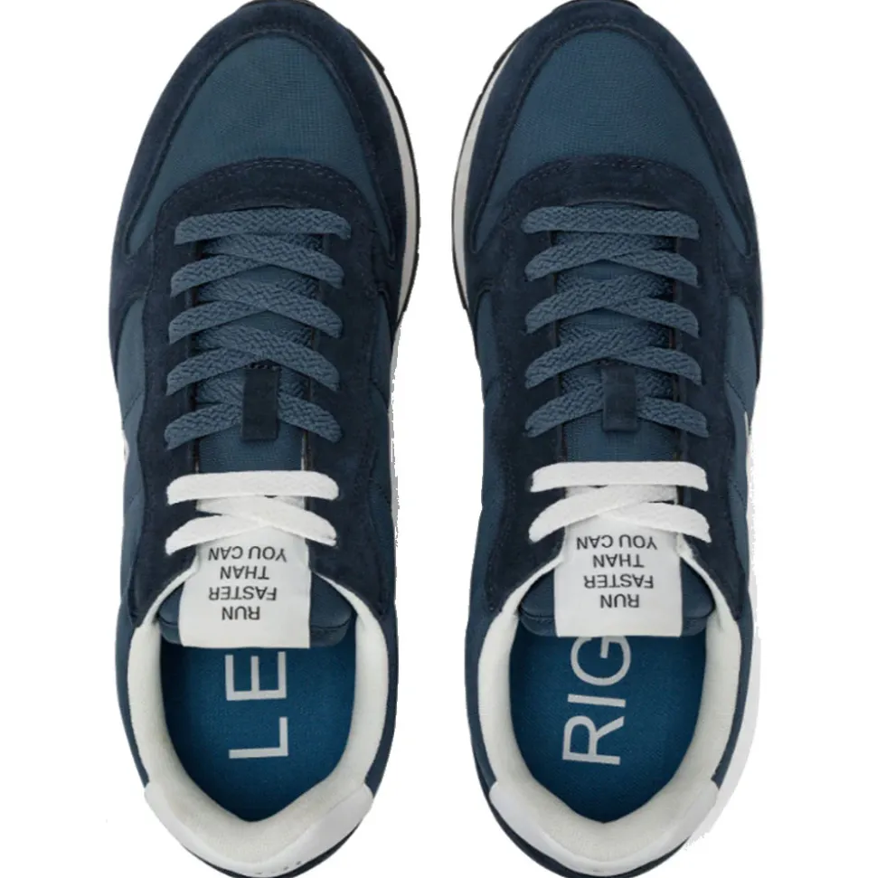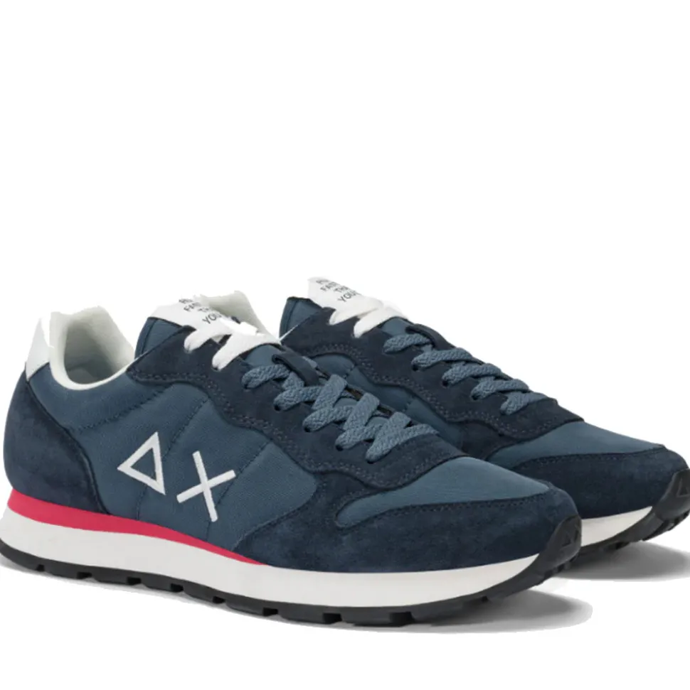 Le scarpe Sun68 Running Tom Solid Navy Blue sono realizzate con una tomaia, sulla quale è ricamato il logo Sun68, in nylon bianco e inserti in pelle scamosciata mentre l’intersuola in Eva in grado di garantire stabilità e performance si presenta con una doppia veste di colori: navy blue e bianco.